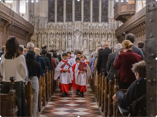 The Quiristers, Back rows and Eton choir processing in their red cassocks.