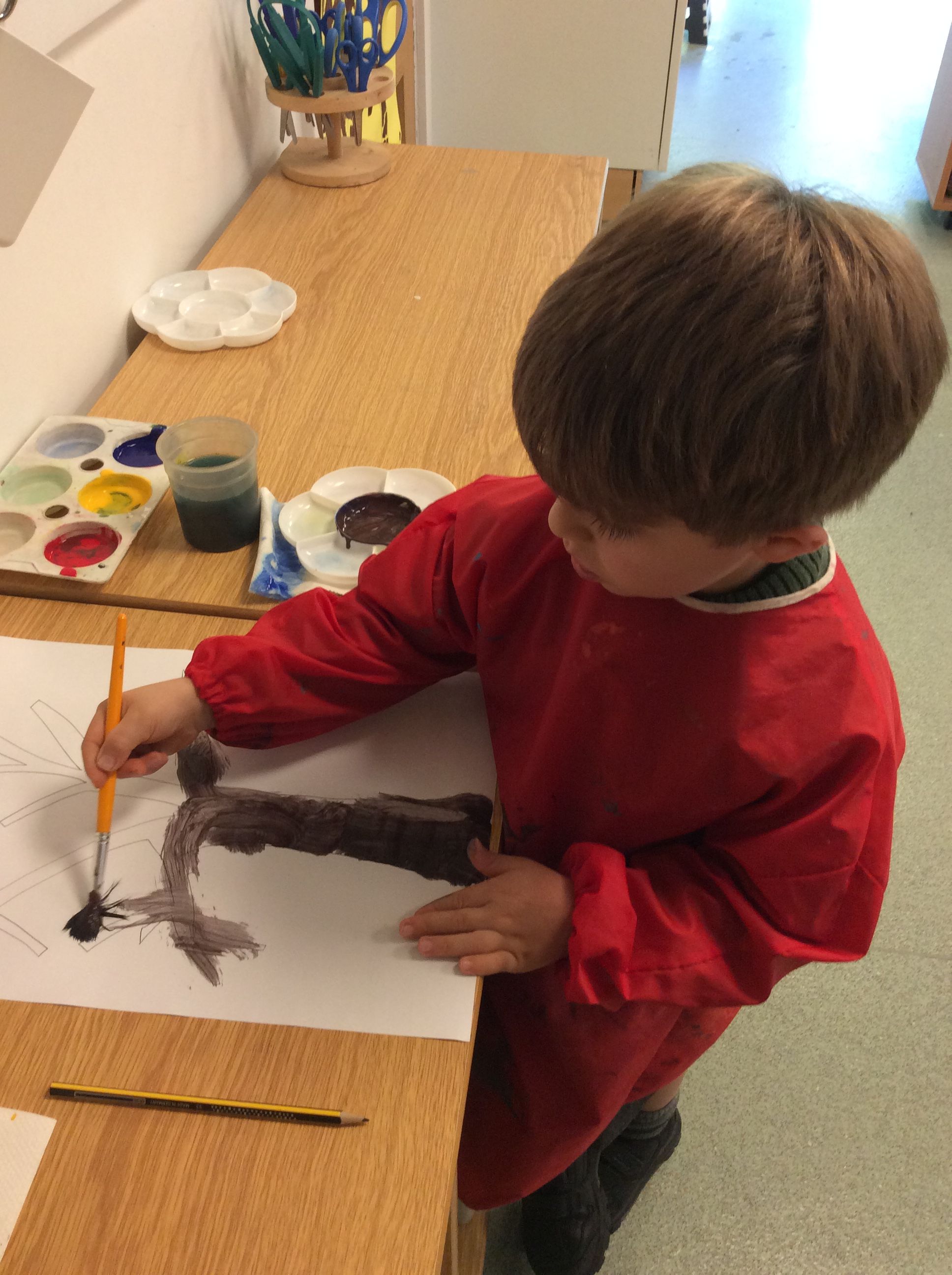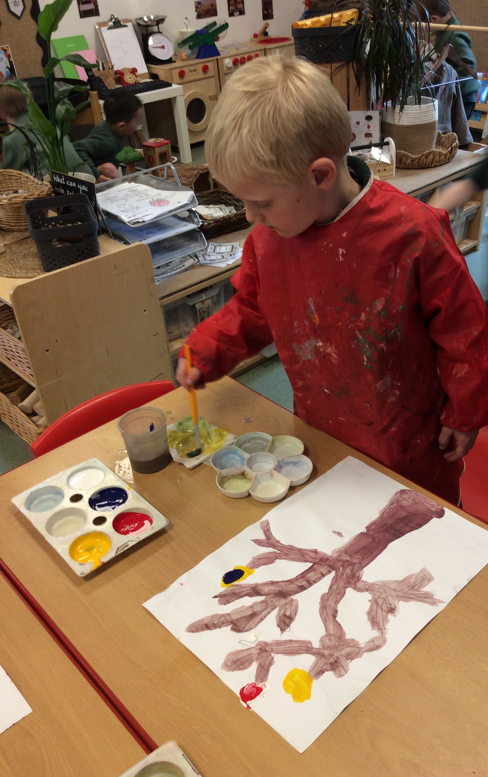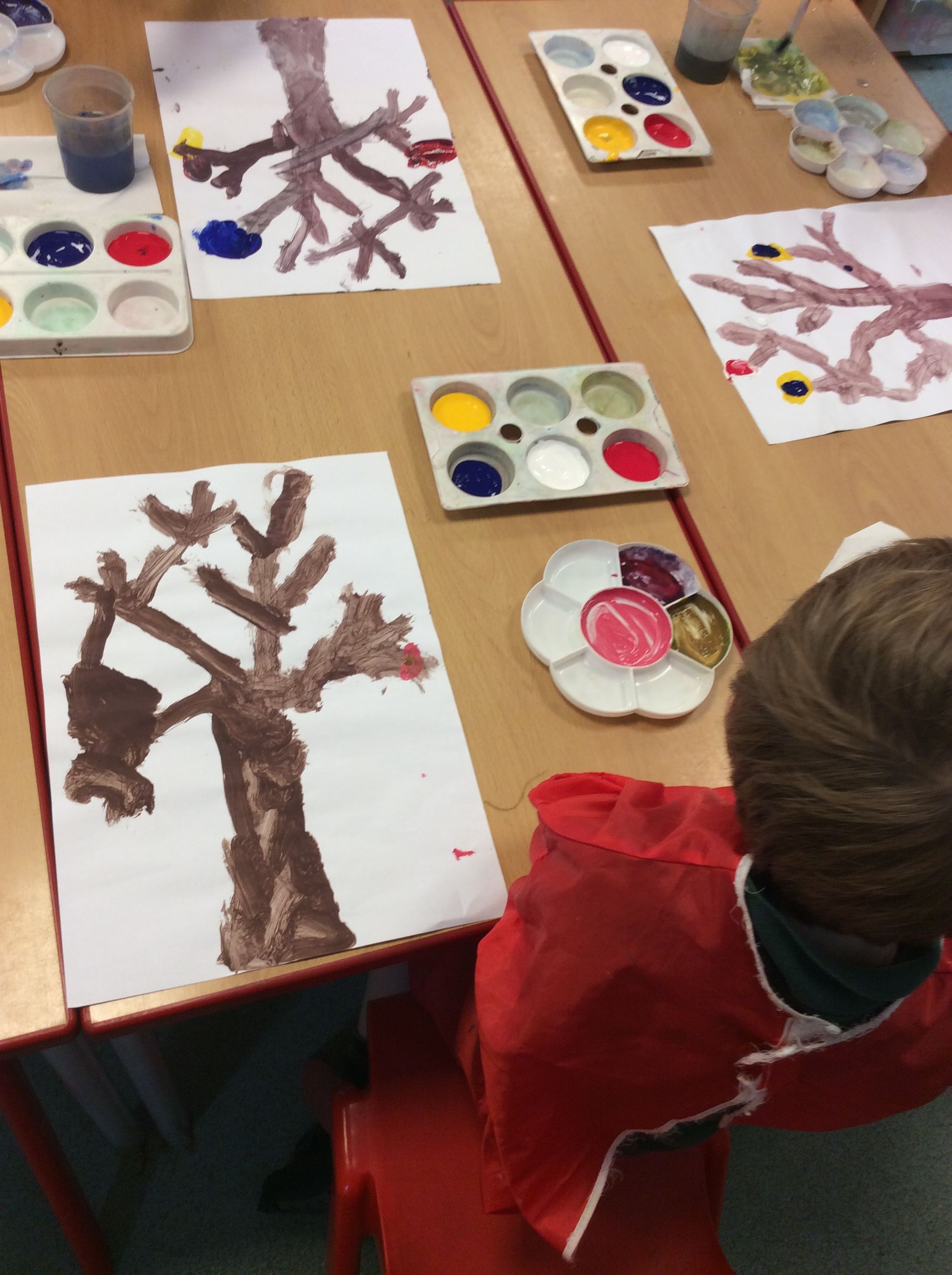 Using Kandinsky as an inspiration, the boys had a go at creating Trees of Life of their own over several sessions. Firstly, colour mixing primary colours to create secondary colours, secondly, transforming a plain trunk and branches of a tree into a hub of different brown bases, followed by lastly, adding beautiful concentric leaves in different colours and shades.