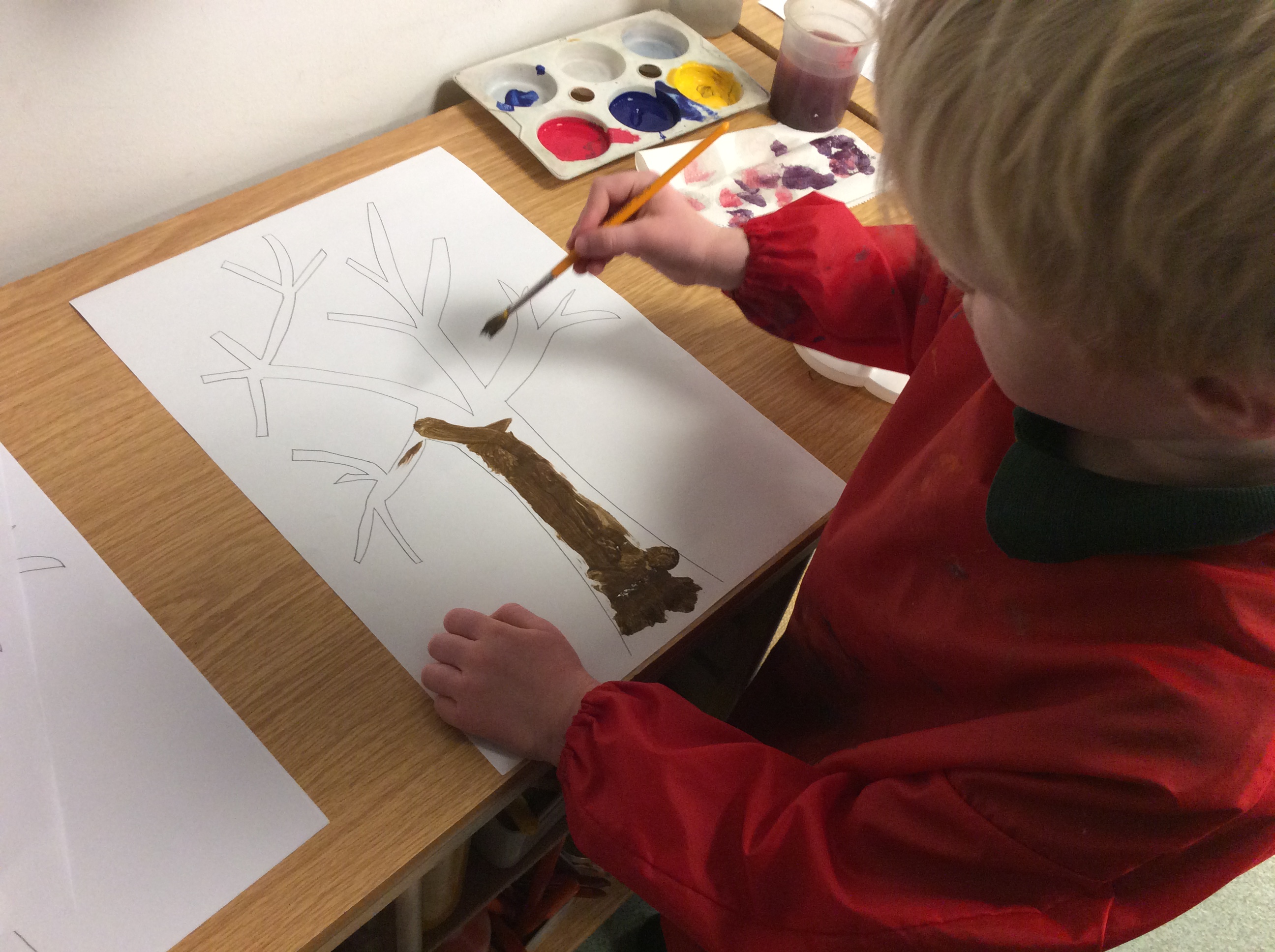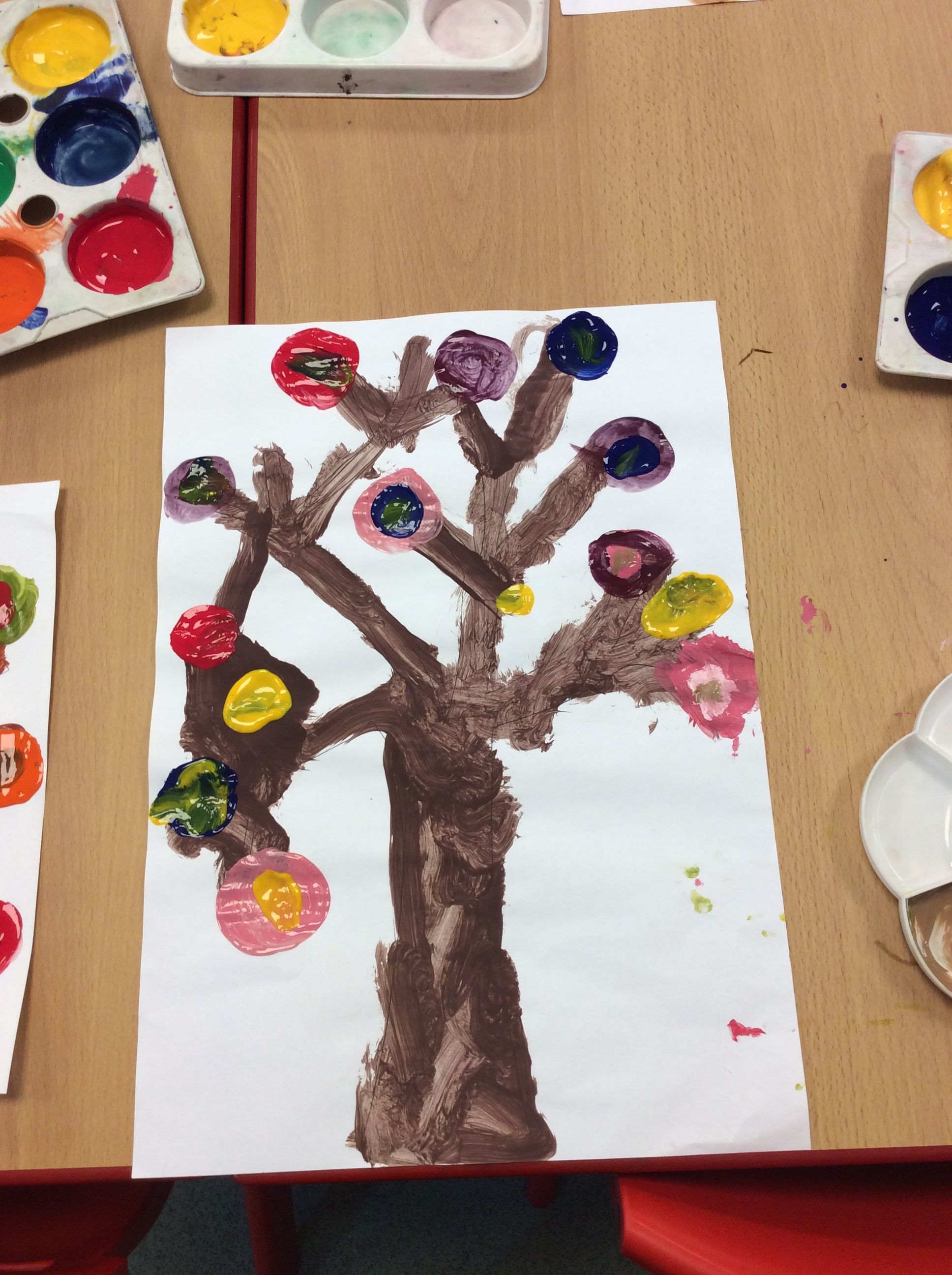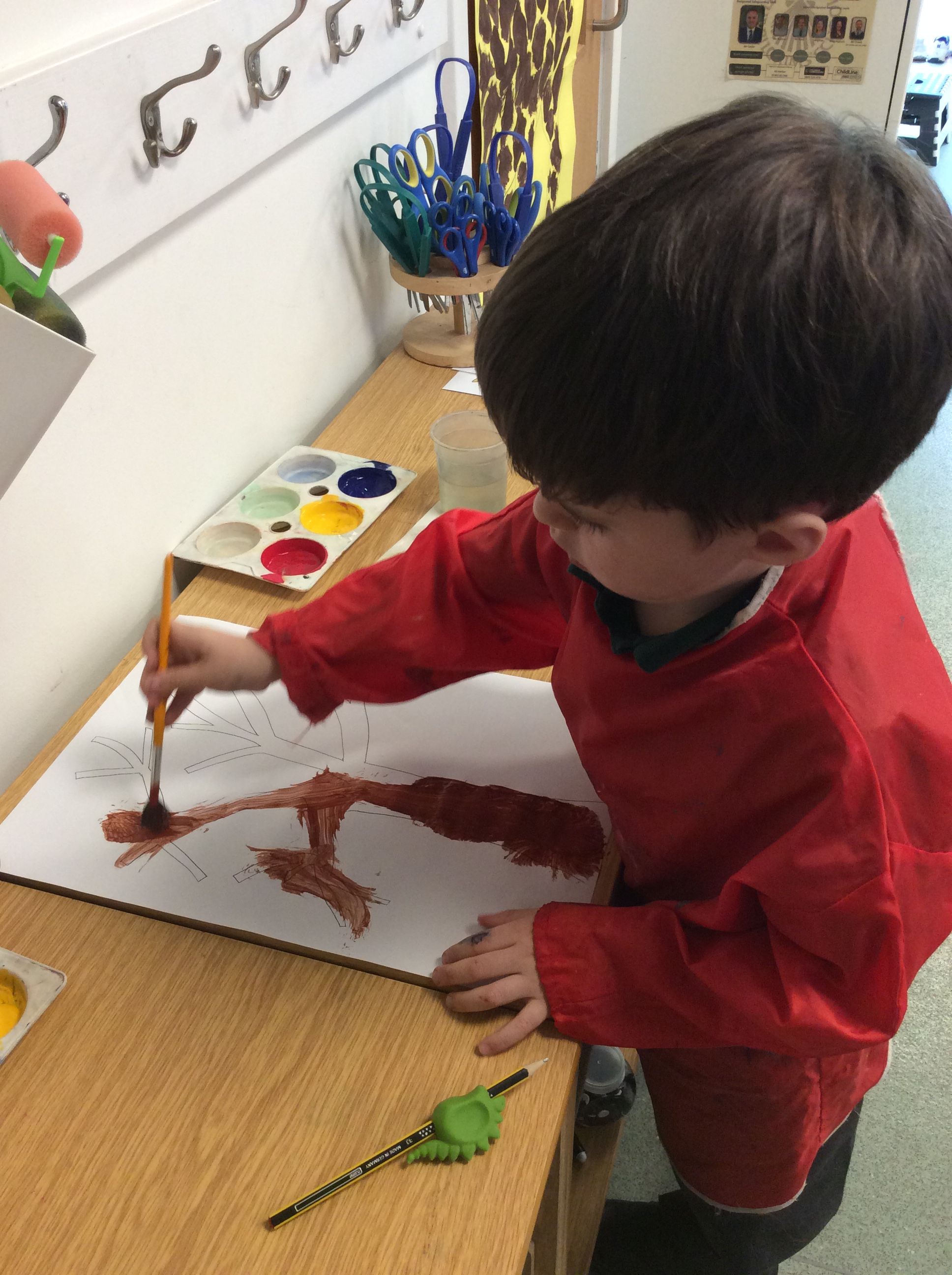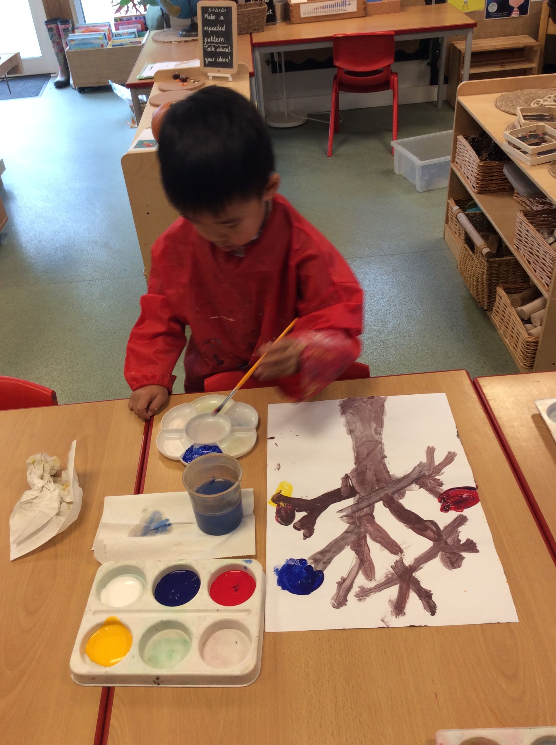 Using Kandinsky as an inspiration, the boys had a go at creating Trees of Life of their own over several sessions. Firstly, colour mixing primary colours to create secondary colours, secondly, transforming a plain trunk and branches of a tree into a hub of different brown bases, followed by lastly, adding beautiful concentric leaves in different colours and shades.