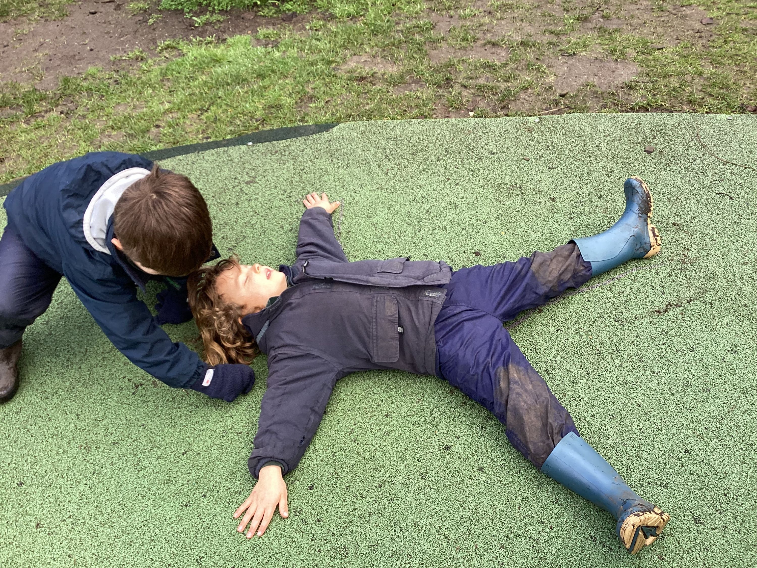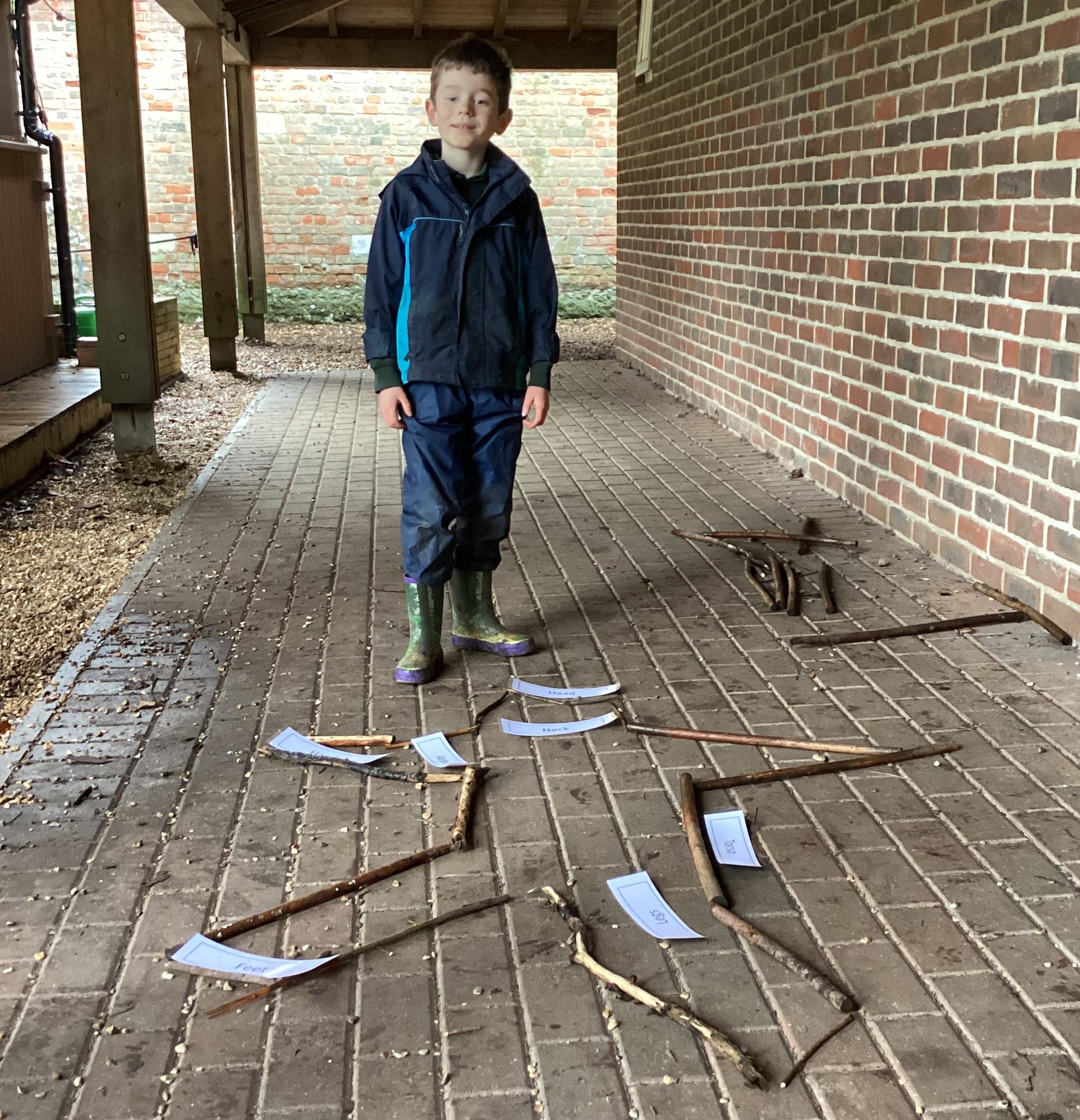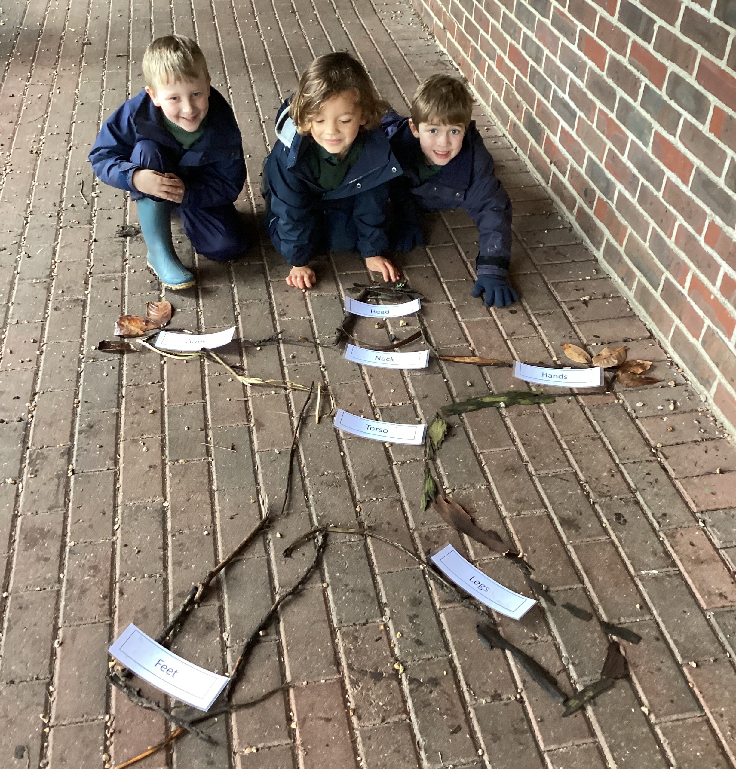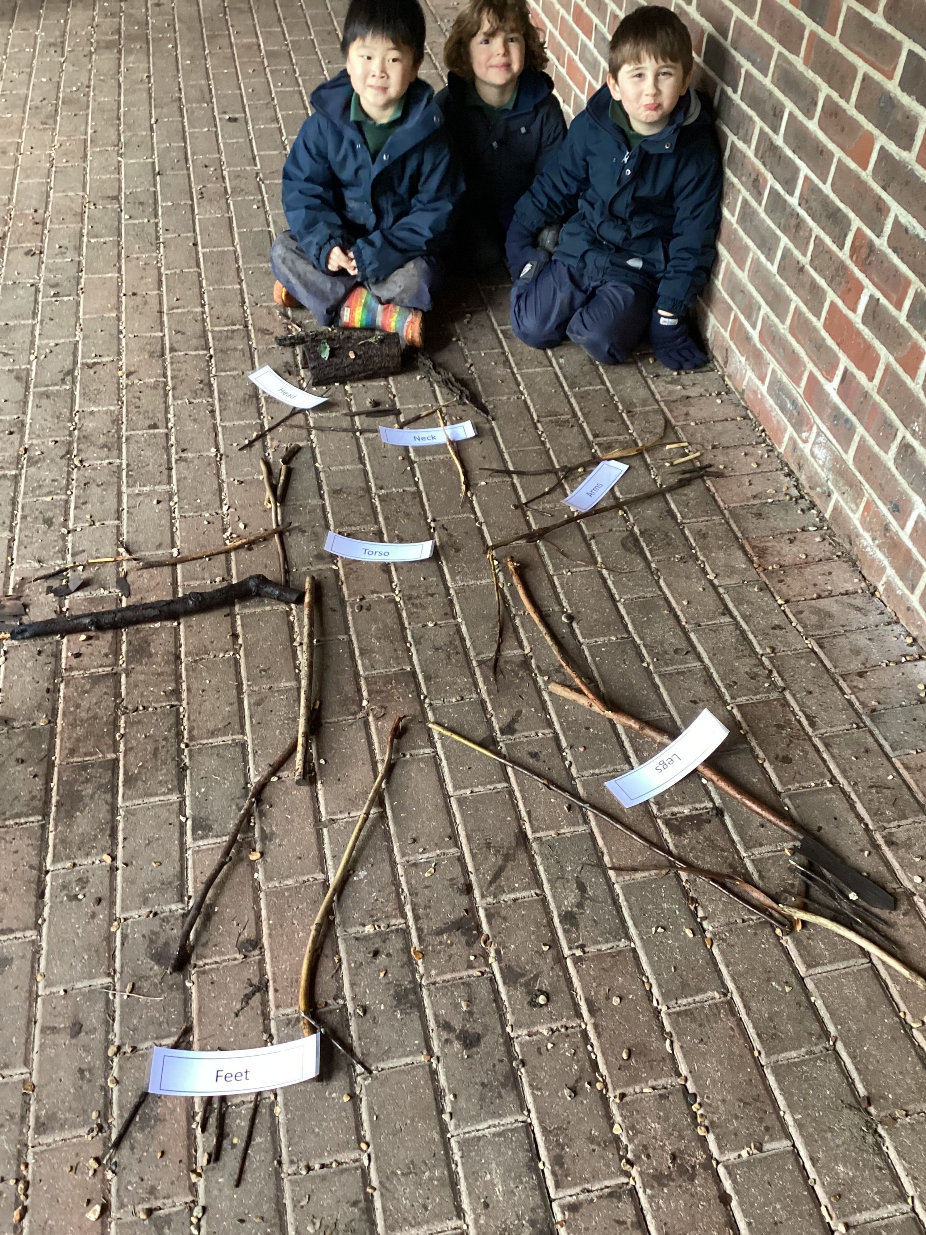 Year 1’s Forest School session was linked to their science curriculum this week. The boys enjoyed creating a chalk outline of someone and then had to identify where various senses were located on the outline. We then had fun creating a huge stick outline and again, using labels, the boys needed to create the key features of the human body. Some of the boys even personalised their stick outlines.