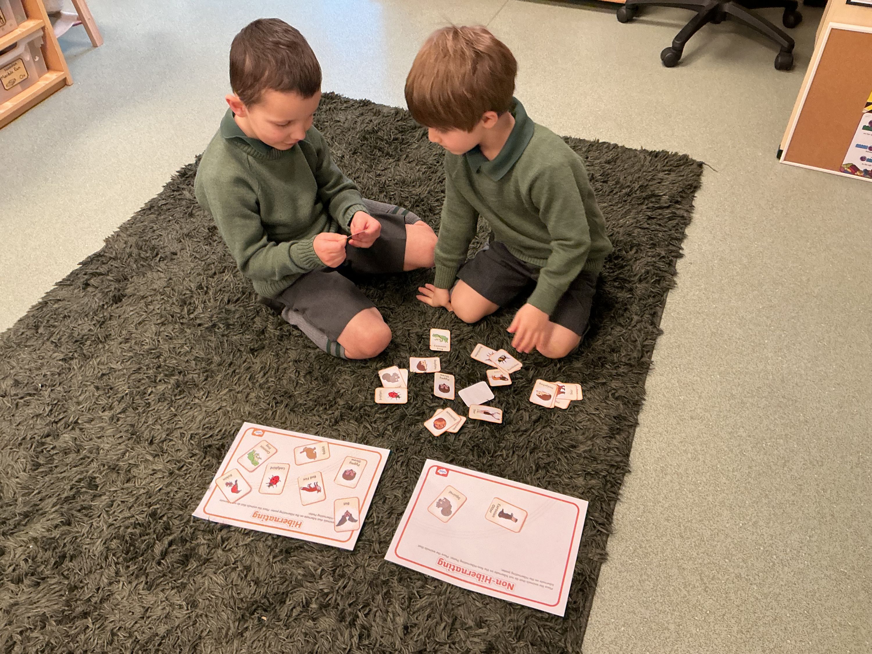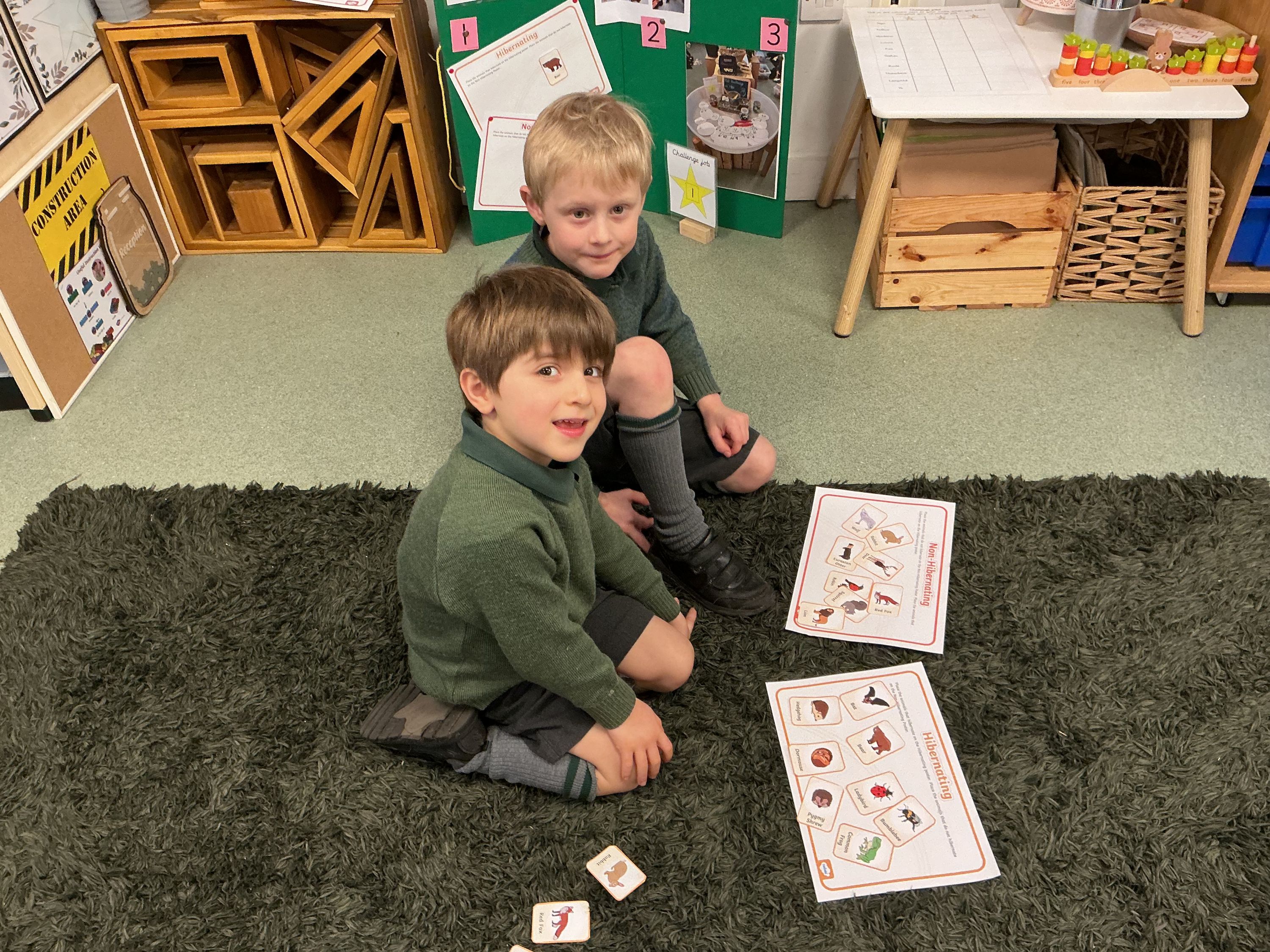 After discovering which animals and insects hibernate, and where they choose to rest, the boys completed class “Challenge Jobs” linked to hibernation. Working brilliantly in pairs, picture cards were sorted into two groups: Hibernating and Non-hibernating. The boys were quite clear and confident about most of their choices and, most importantly, could explain their reasoning. Some took a bit of further investigation and research.