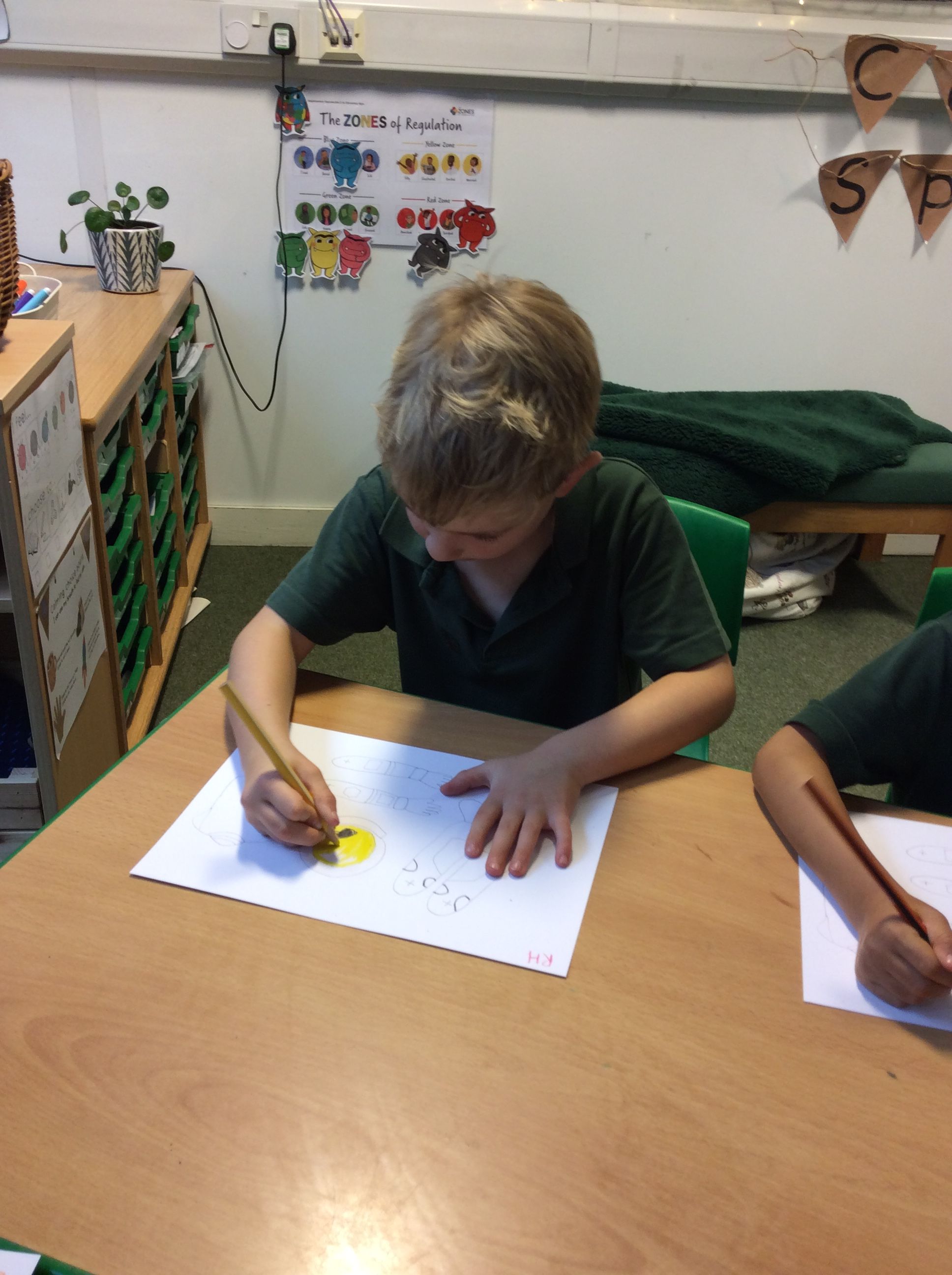 In other space-themed activities this week, the boys have practised colour mixing to imagine what our alien friend Beegu’s planet might look like. We have used different 2D shapes to create rockets. We have practised careful cutting by making an astronaut’s helmet out of a paper plate as well as creating a spaceman using split pins. The boys have been introduced to VERBS as a word class this week, and I was particularly impressed with their ideas of action words they could use to describe how an astronaut might board a rocket and how that rocket might blast off from earth. Lots of creative thinking on display in the Year 1 classroom this week!