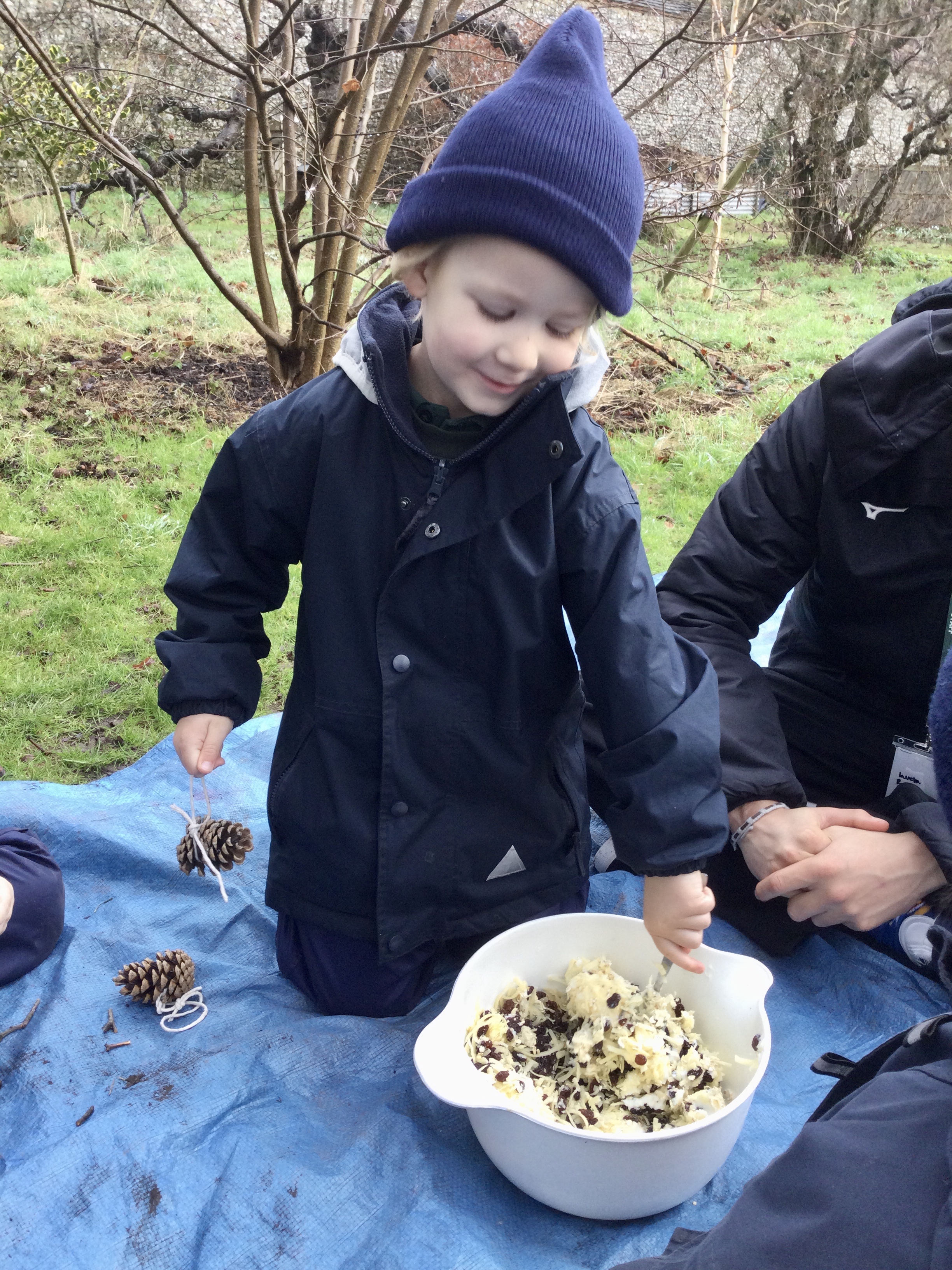 This weekend it is the RSPB Big Garden Birdwatch. Many people across the country will be carrying out surveys to see which birds visit their gardens. With this in mind, the boys in both Year R and Year 1 learned how to make some very tasty fir cone feeders, as well as some Cheerio bird feeders. The boys listened well to the instructions and enjoyed combining the ingredients in order to make a gooey mixture for the fir cone feeders.