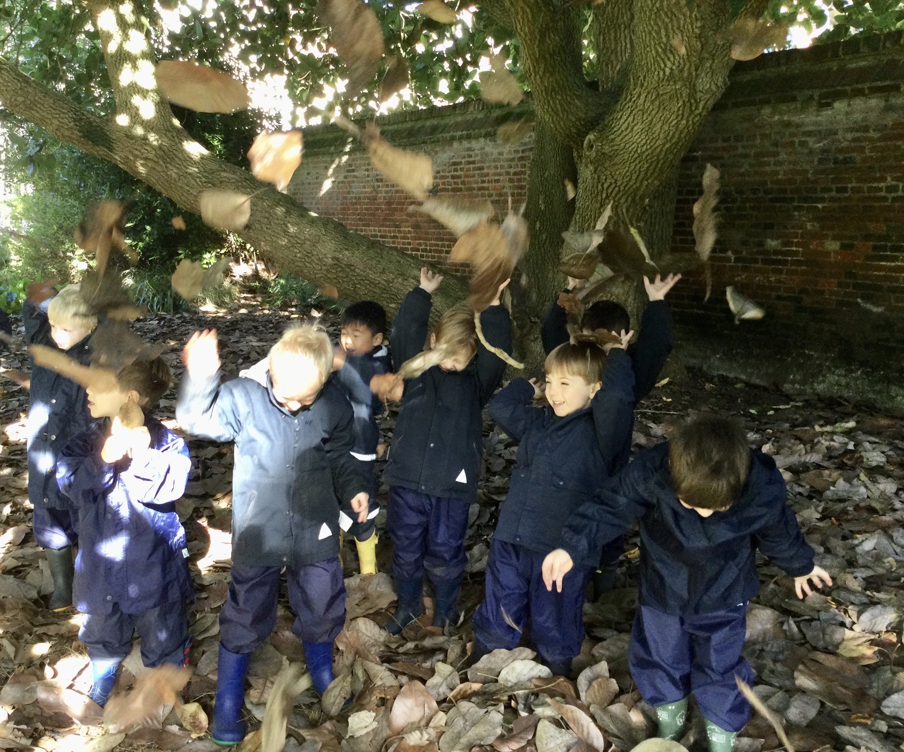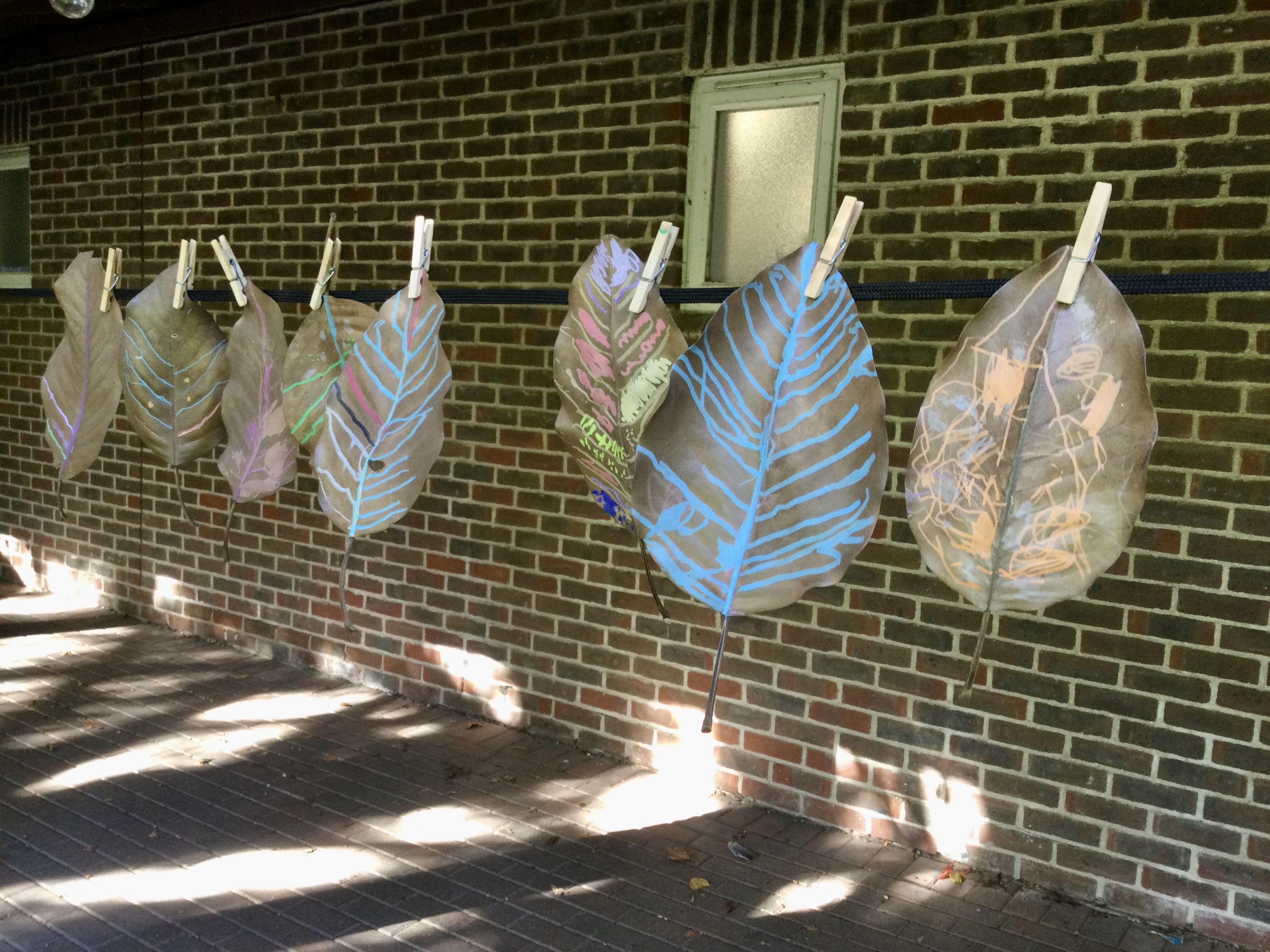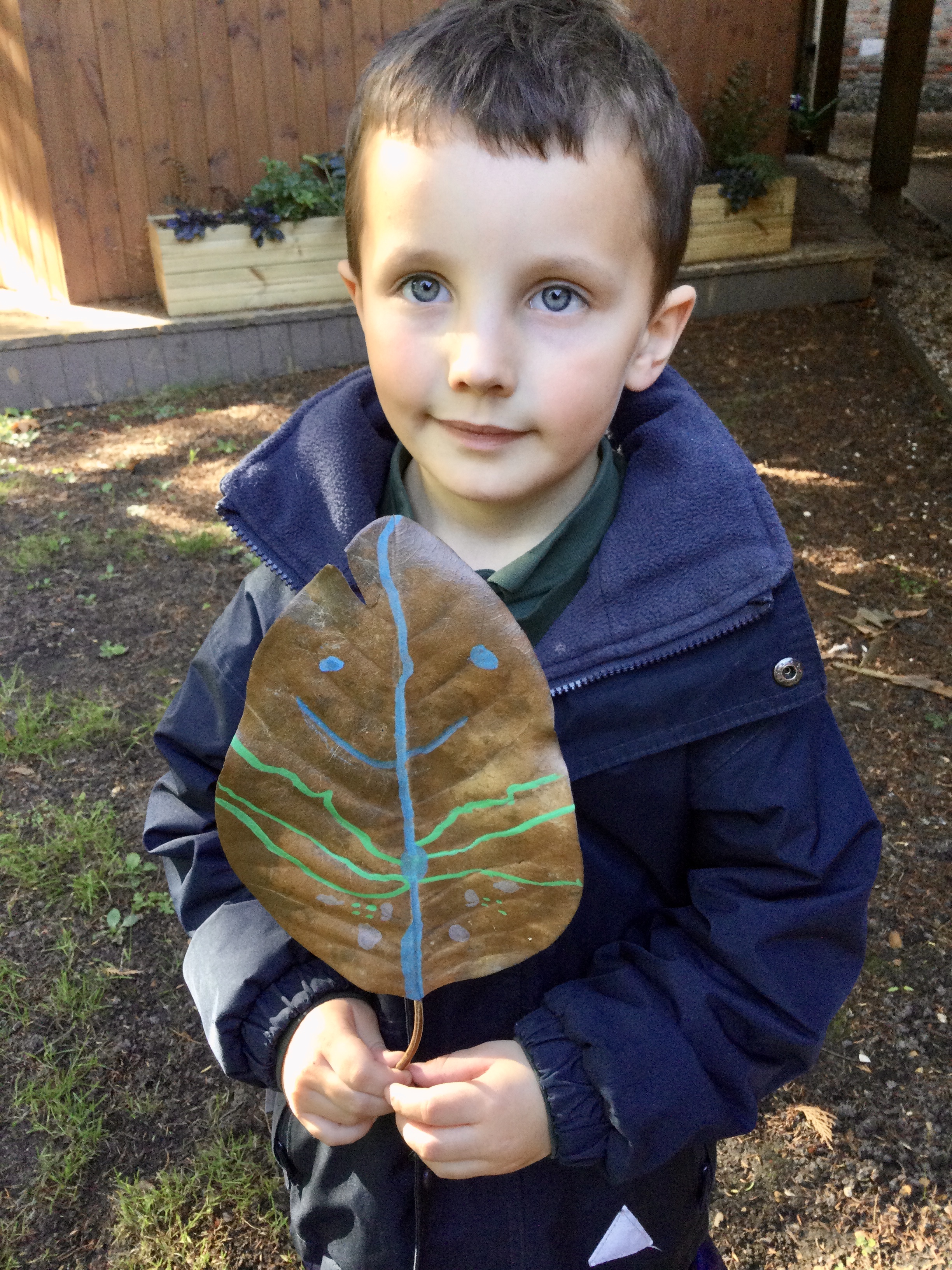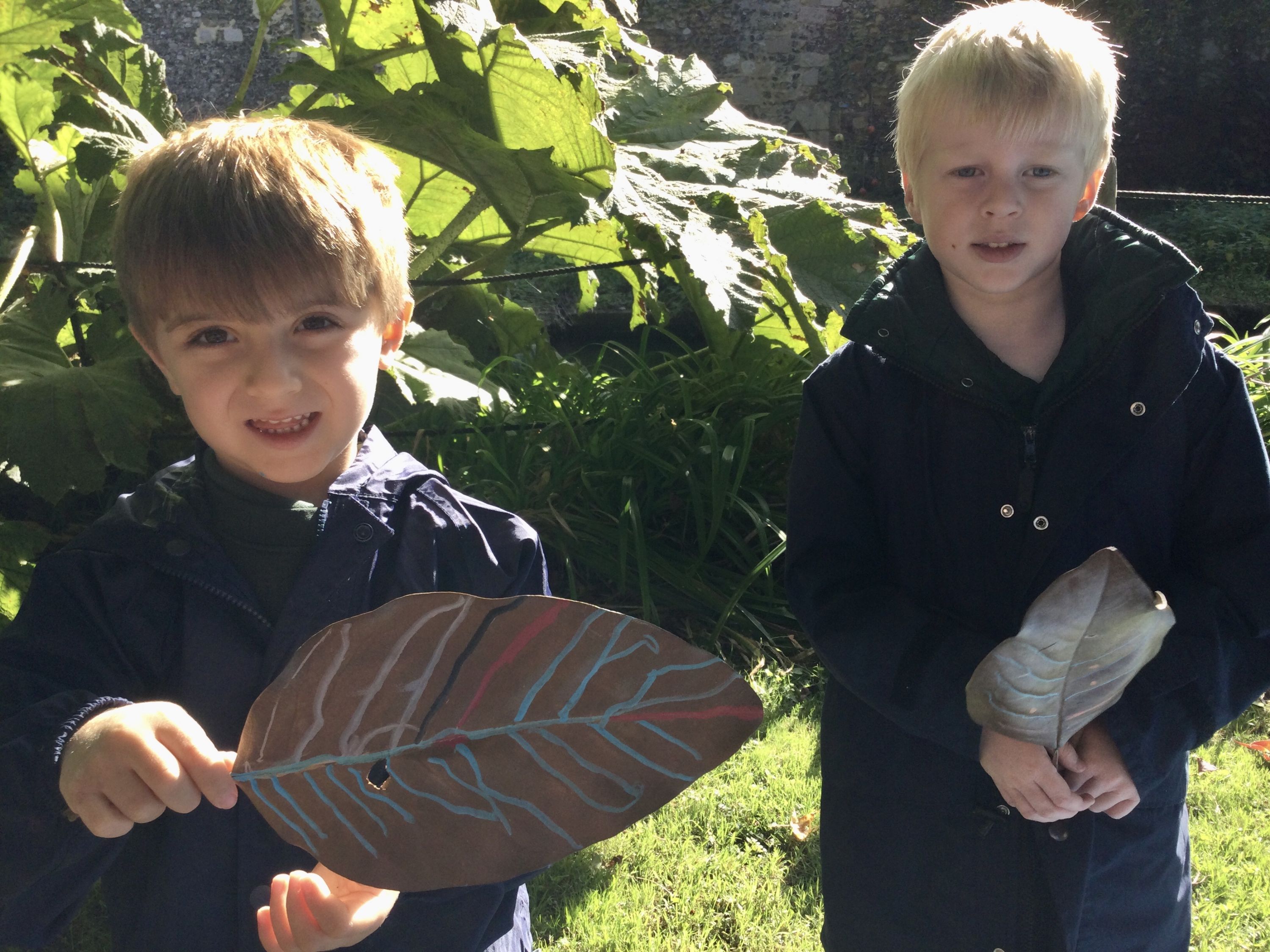 The leaves are a wonderful resource for us, and the boys in Year R very much enjoyed going on a leaf hunt at the front of the school and then learning how to follow the patterns on the leaves using some acrylic pens. We then proudly placed them in our temporary art gallery for everyone to admire.