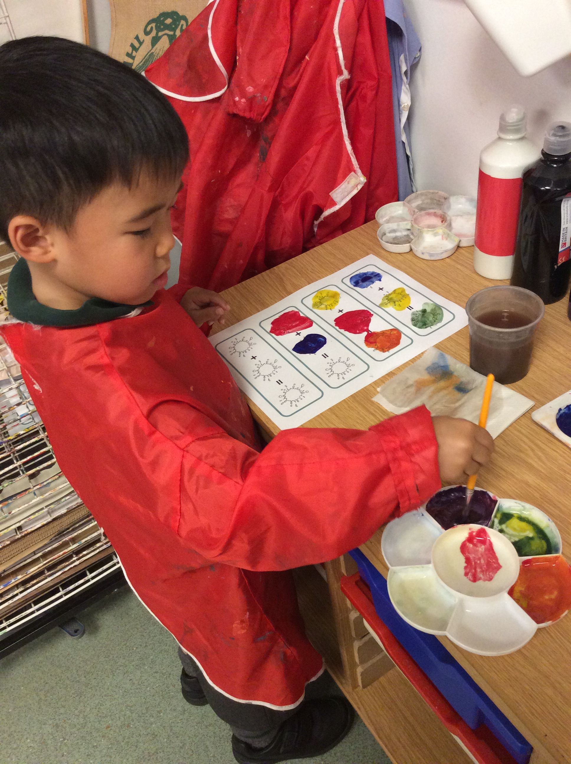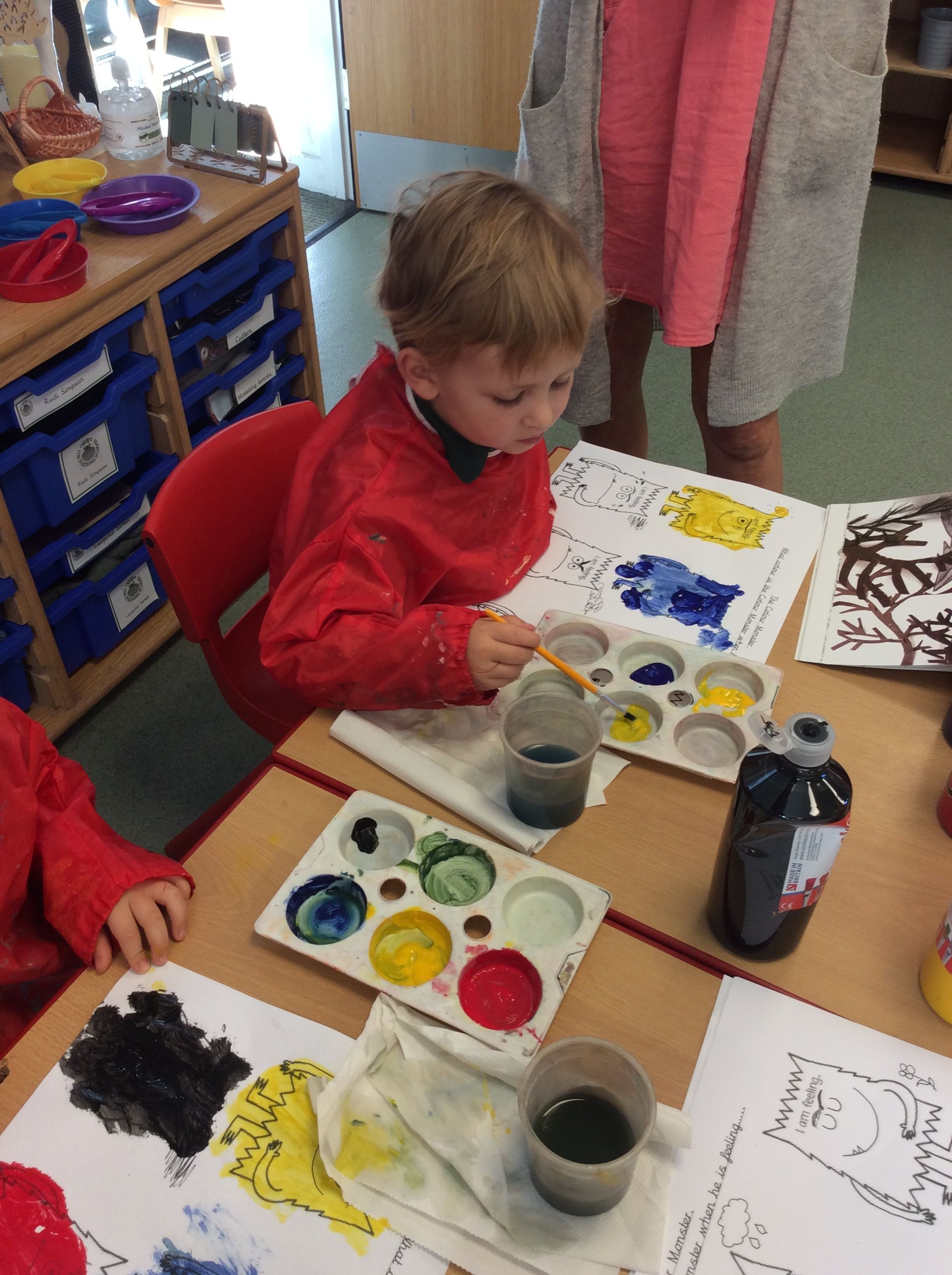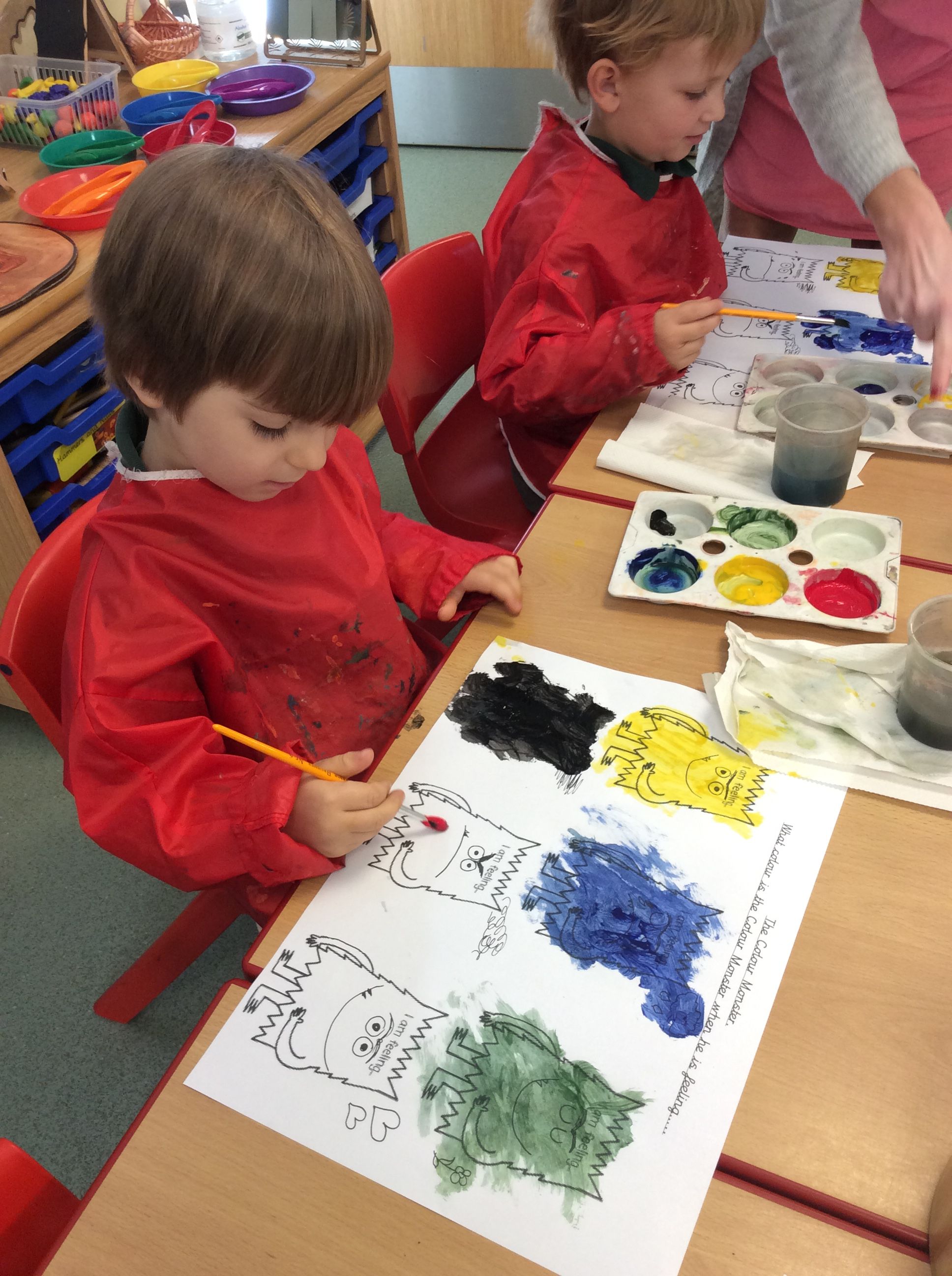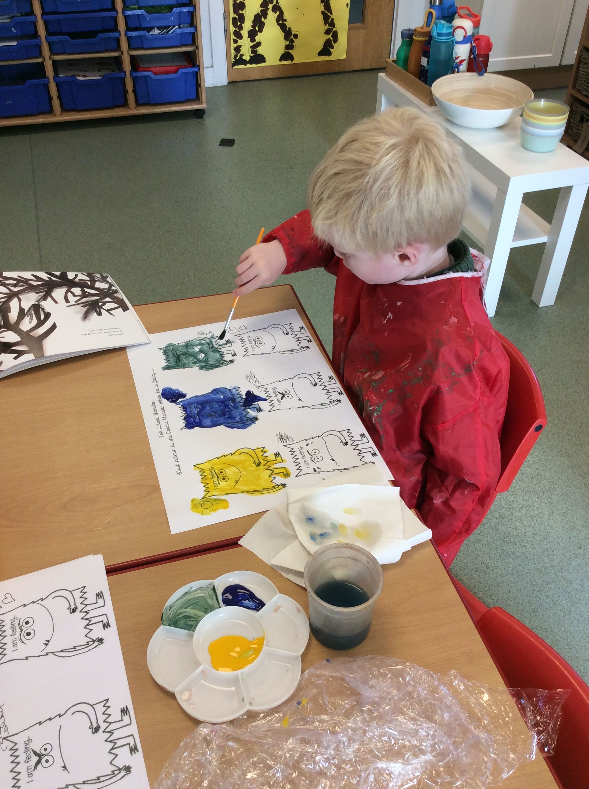 The boys enjoyed painting Colour Monsters using the correct colour for each emotion. They had to remember how to mix pink and that this colour matched 'loved' also. Clear understanding was shown of what each colour meant. Super conversations were had alongside the activity.