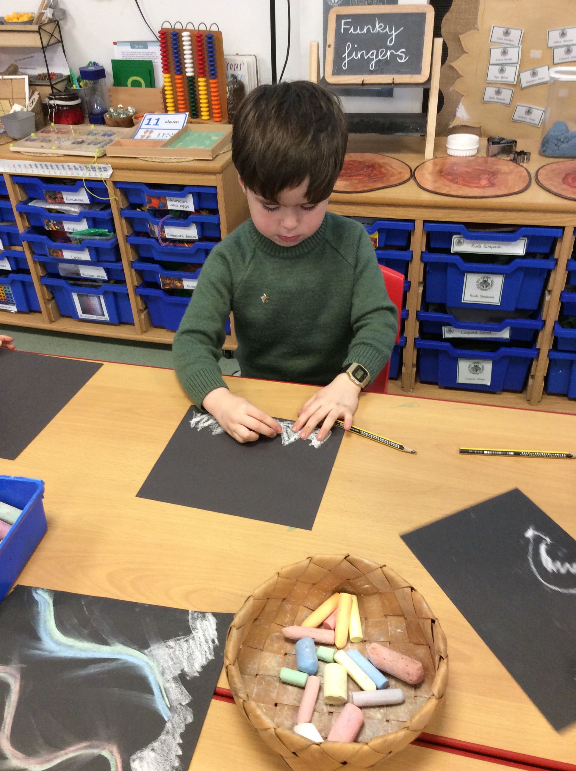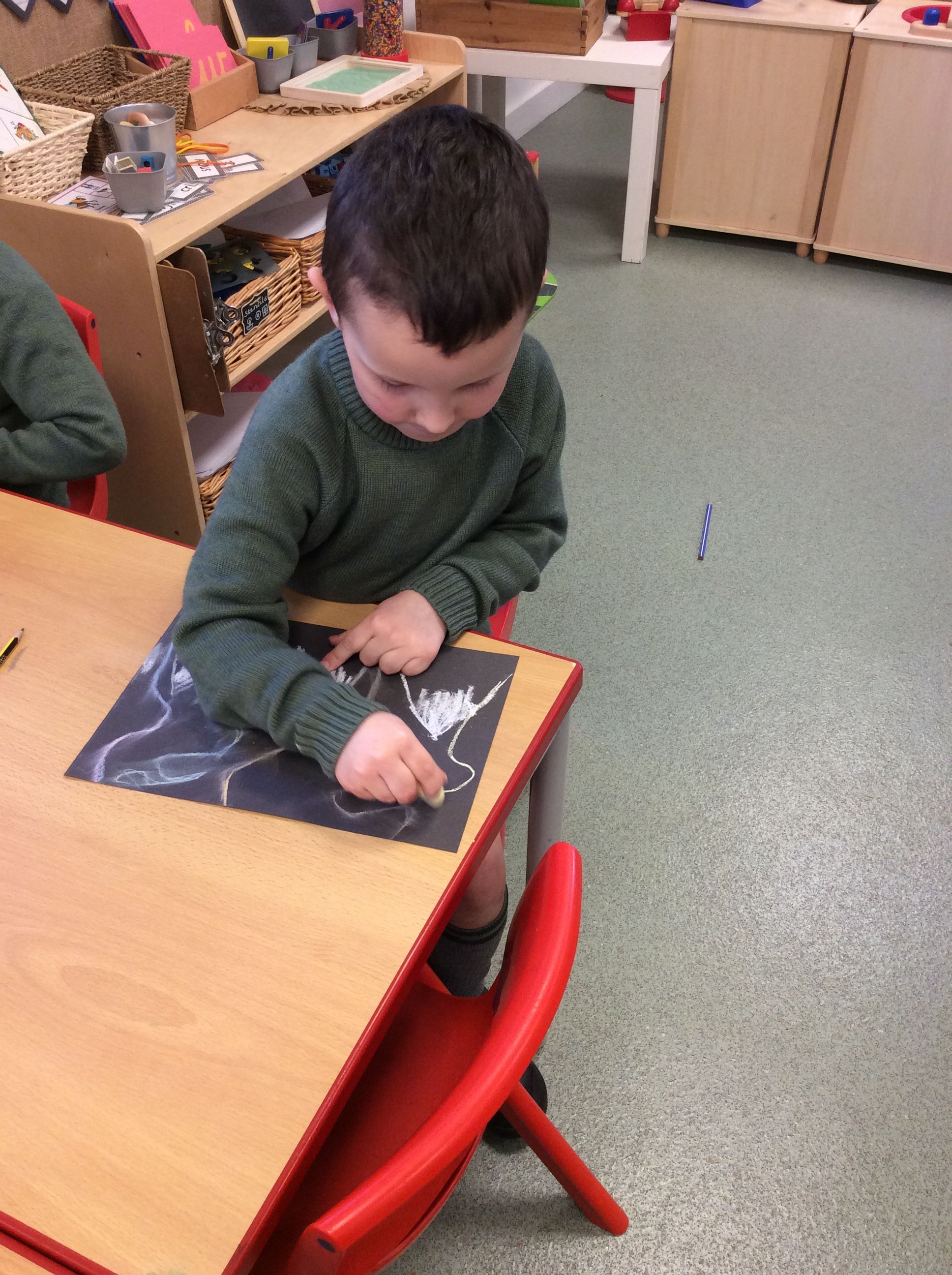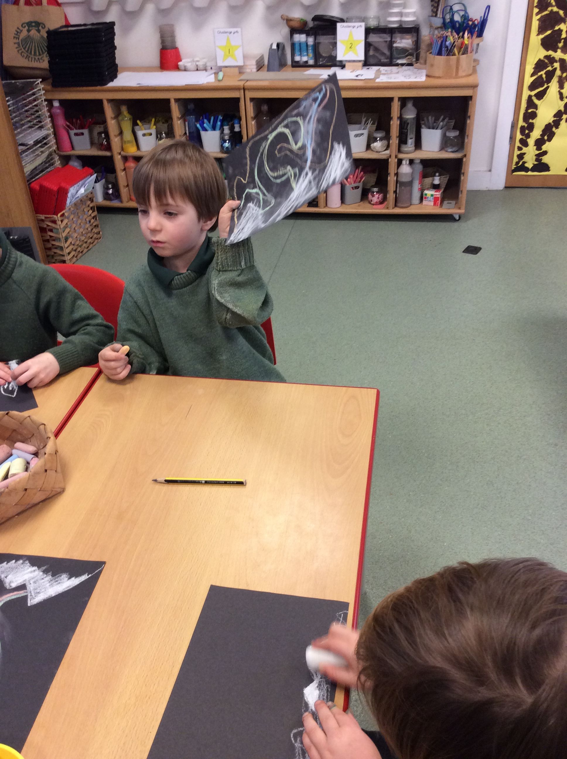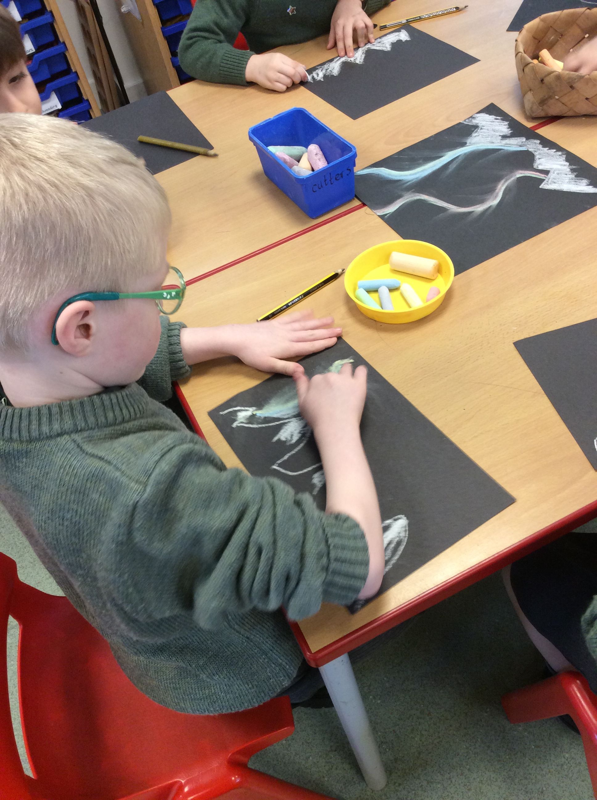 Each week, the boys have built upon their skills and confidence, beginning with experimenting with chalk, then learning how to smudge colours upwards together to enhance the sense of movement, and this week adding mountains to create depth and interest in their scenes. Great care has been taken in their work, with clear progress evident over the weeks.
