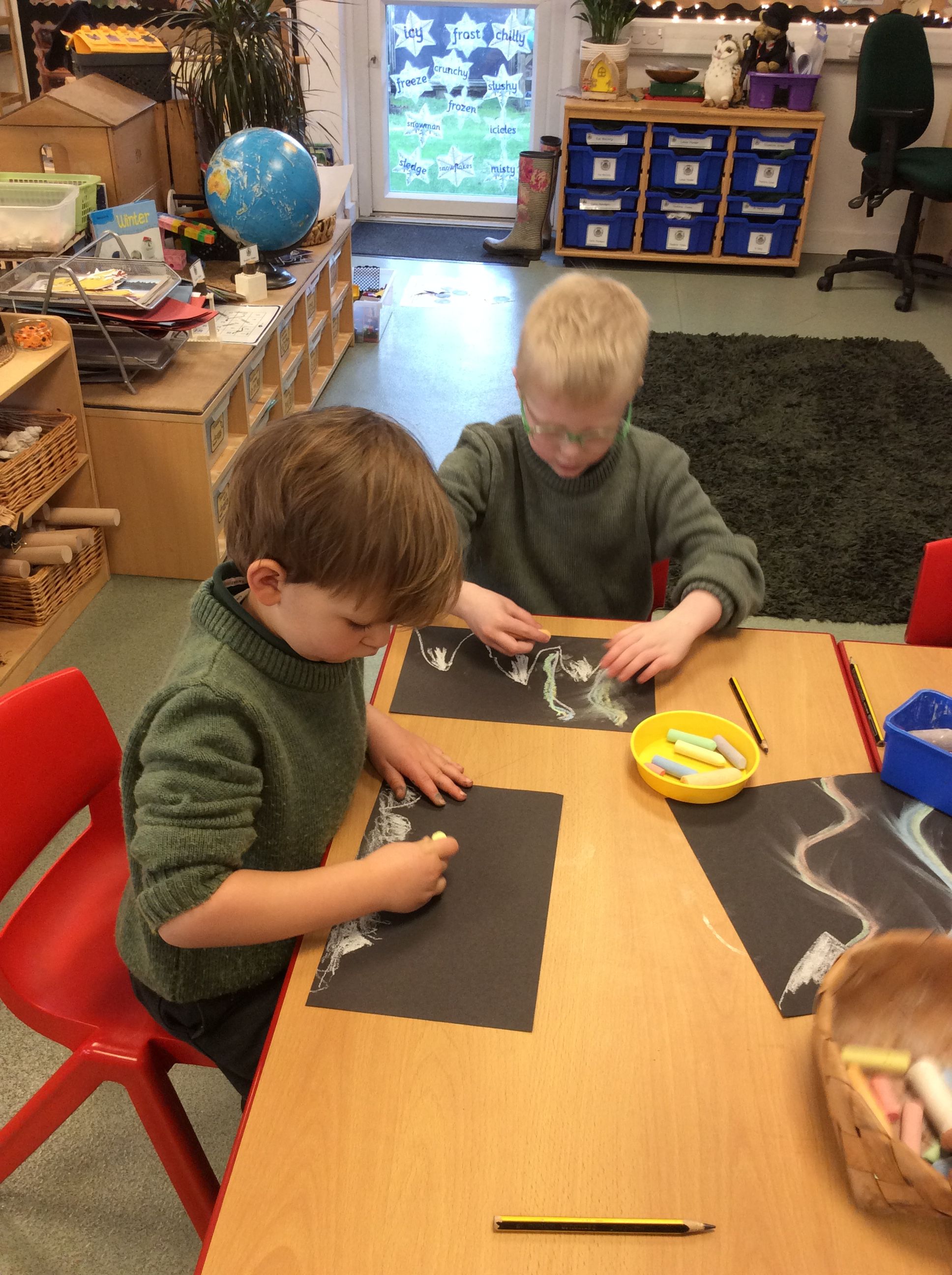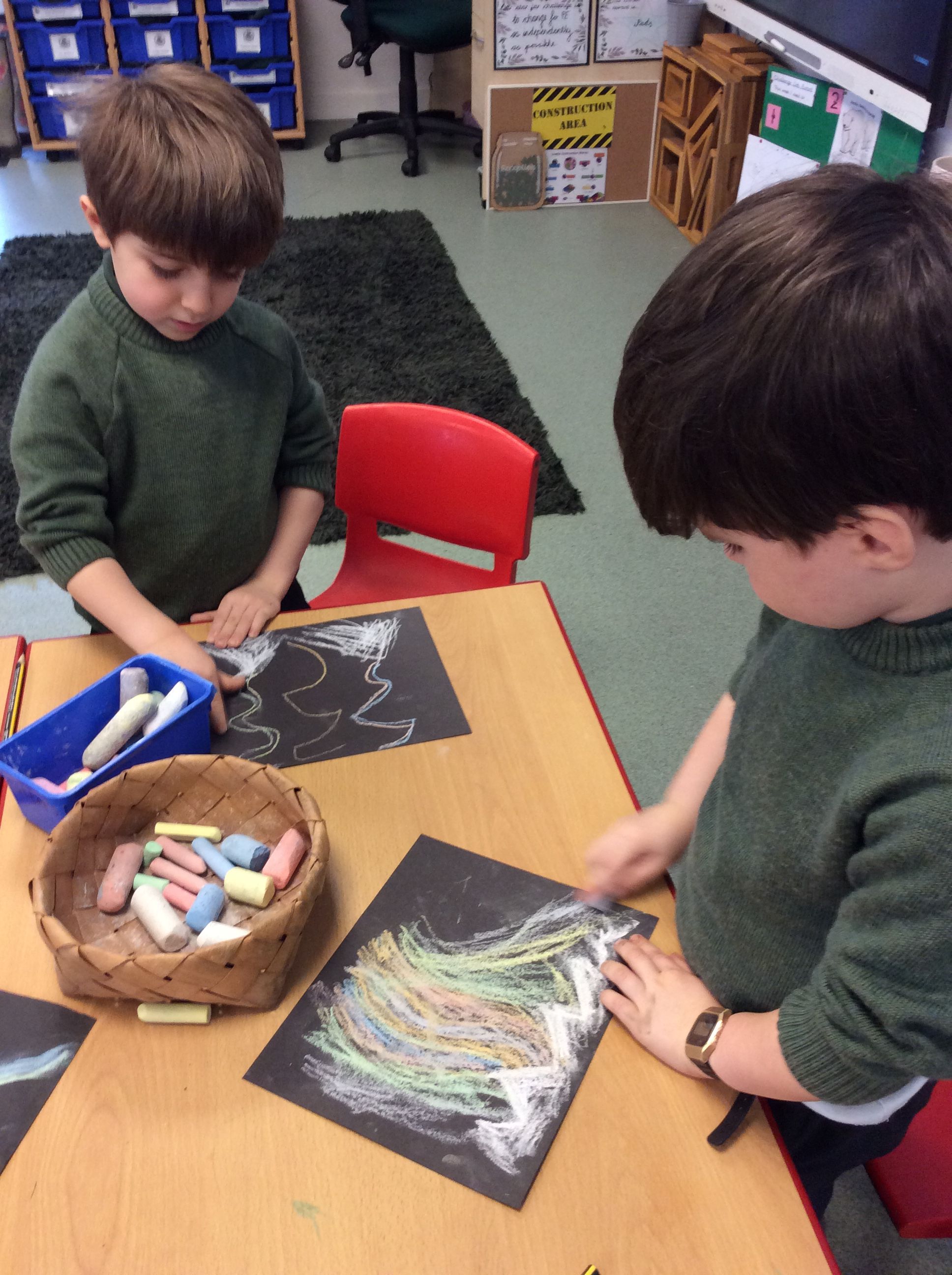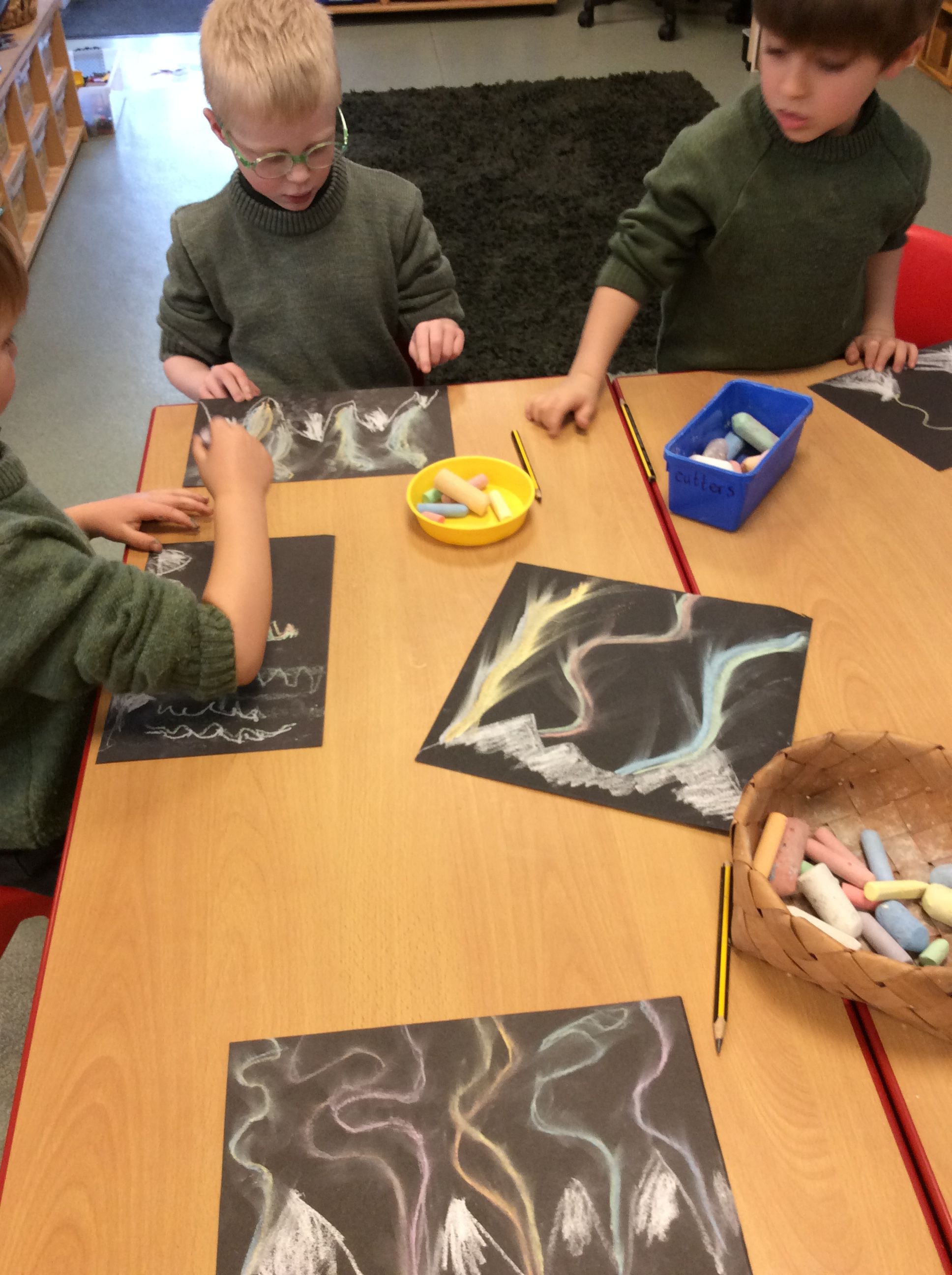 Using chalk on black paper, the boys practised creating the magical effect of the lights by using upward strokes to show movement, as if the lights were dancing across the night sky. They watched short video clips of the Northern Lights forming a variety of patterns and colours and also learnt a little about how this incredible natural phenomenon is created.
