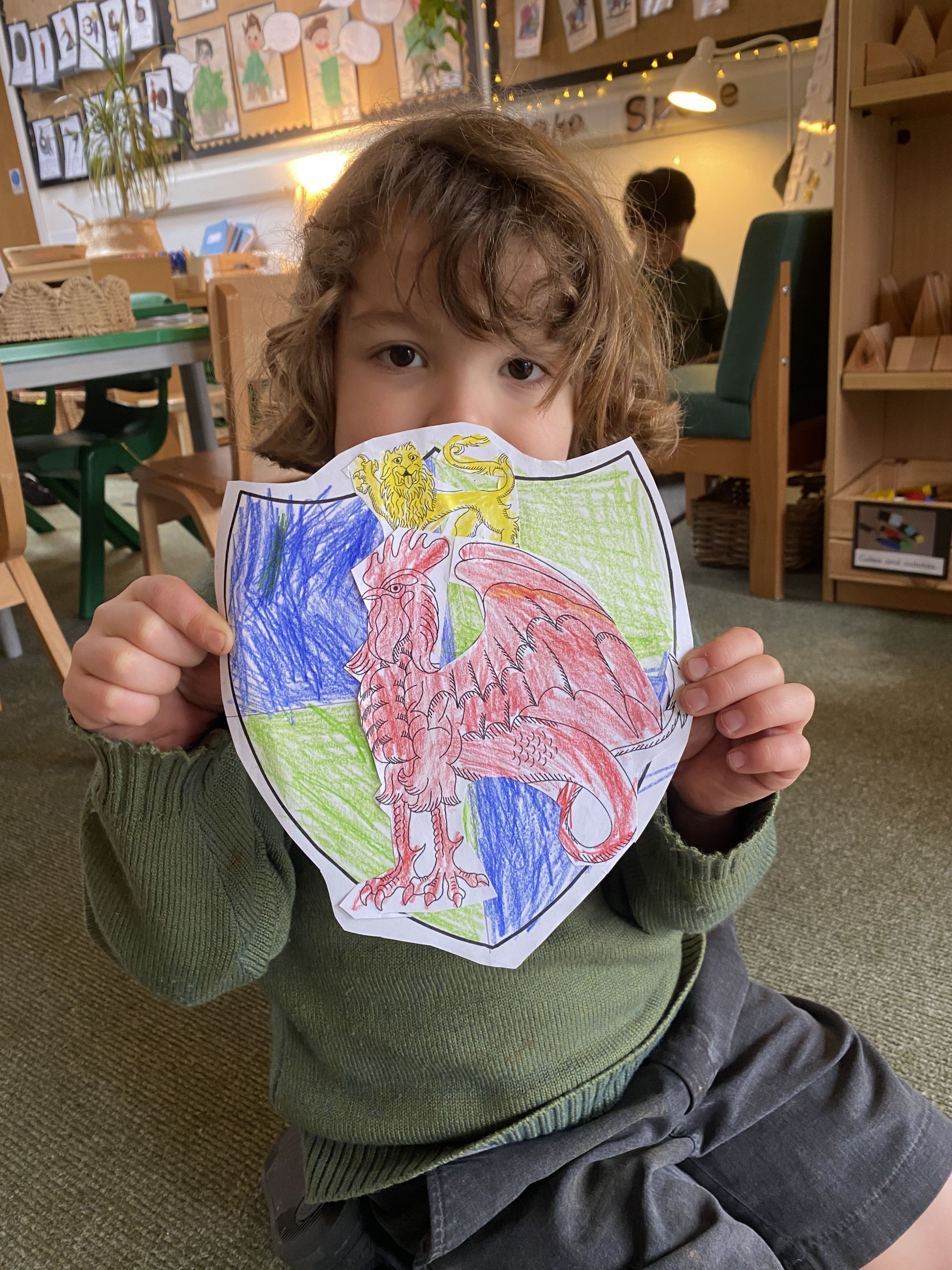 We had an interesting discussion about character traits that made us special, and the boys were extremely perceptive about their choices. For example, Ralph and Henry R chose the cockerel because it represented protecting others and their family. William chose this, but he also wished to add the hare to show he had speed. Hammie chose the stag because it represents being wise and trying to make good choices. Joshua and Henry B chose the eagle for energy and being staying strong even when things get tough. Rufus chose the lion because it represents facing your fears and the badger for not giving up. The Griffin represents courage, which we discussed means being brave, even when you feel a little scared. Artie chose this along with the dog for being reliable.