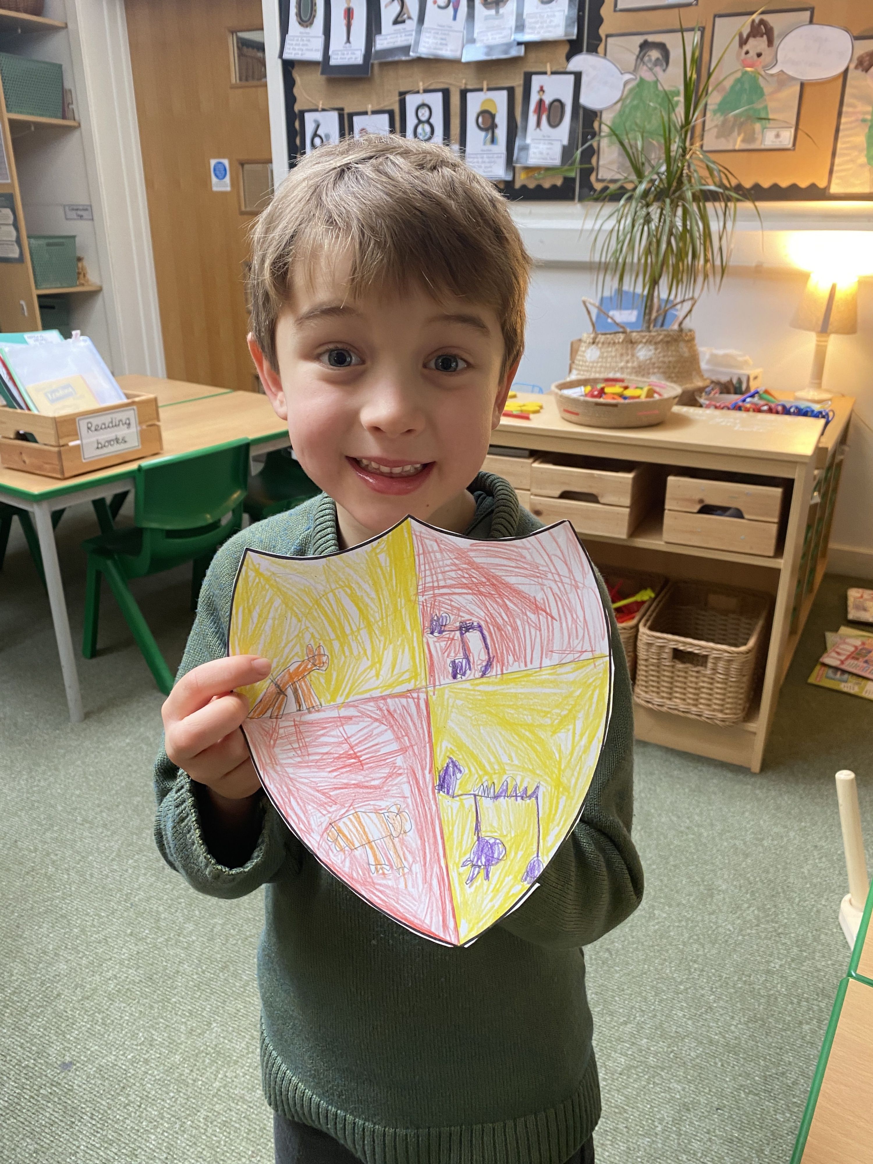 Colour choice was just as important. In heraldry, colours are rich with meaning, and we learned that every shade tells its own story. Red traditionally represents bravery and energy, blue stands for loyalty and truth, green symbolises growth and hope, yellow or gold is linked to generosity and confidence. The boys had to think carefully about which colours best matched their chosen qualities and animals, making thoughtful decisions rather than simply picking favourites. This was a tricky task!