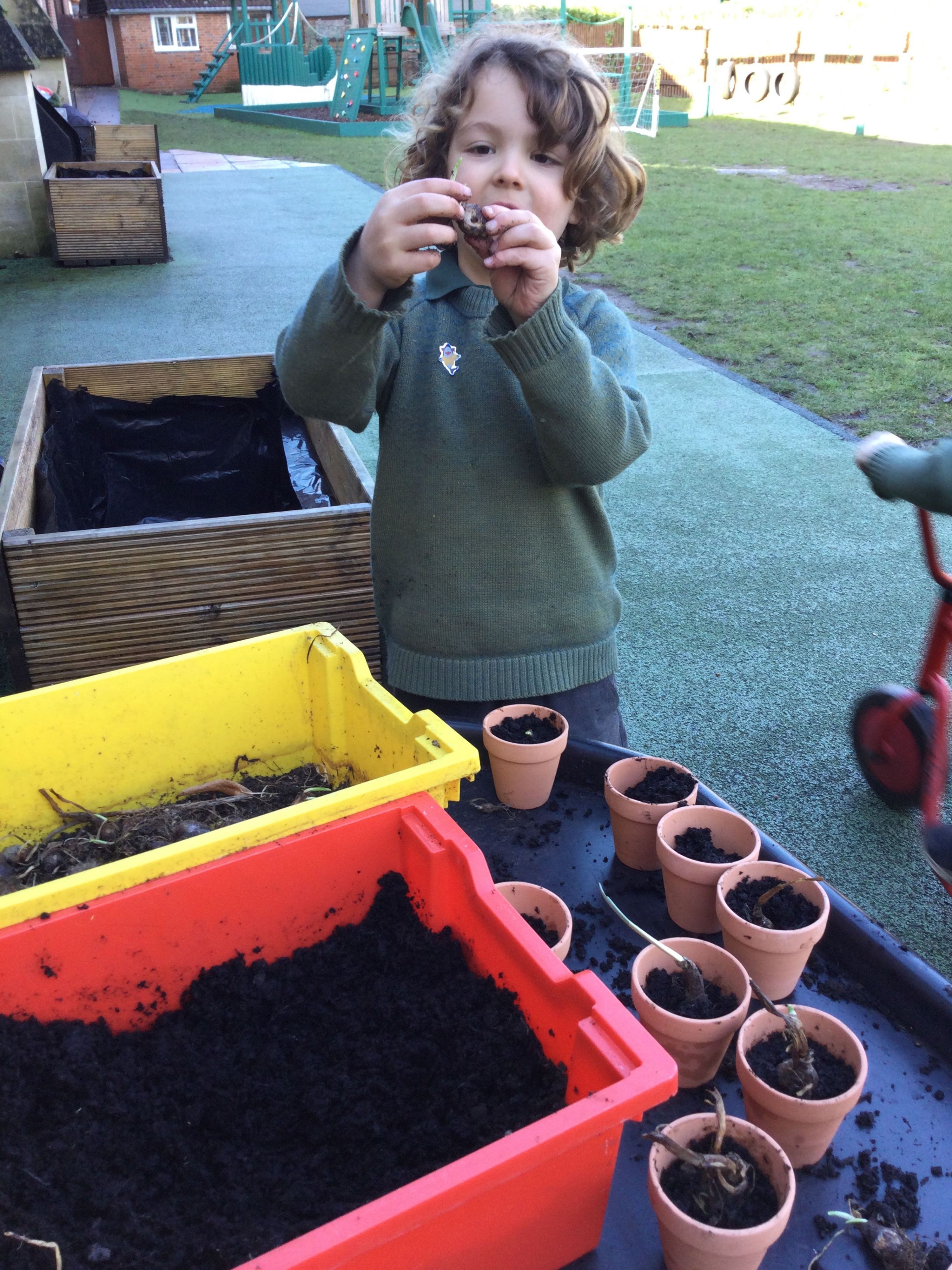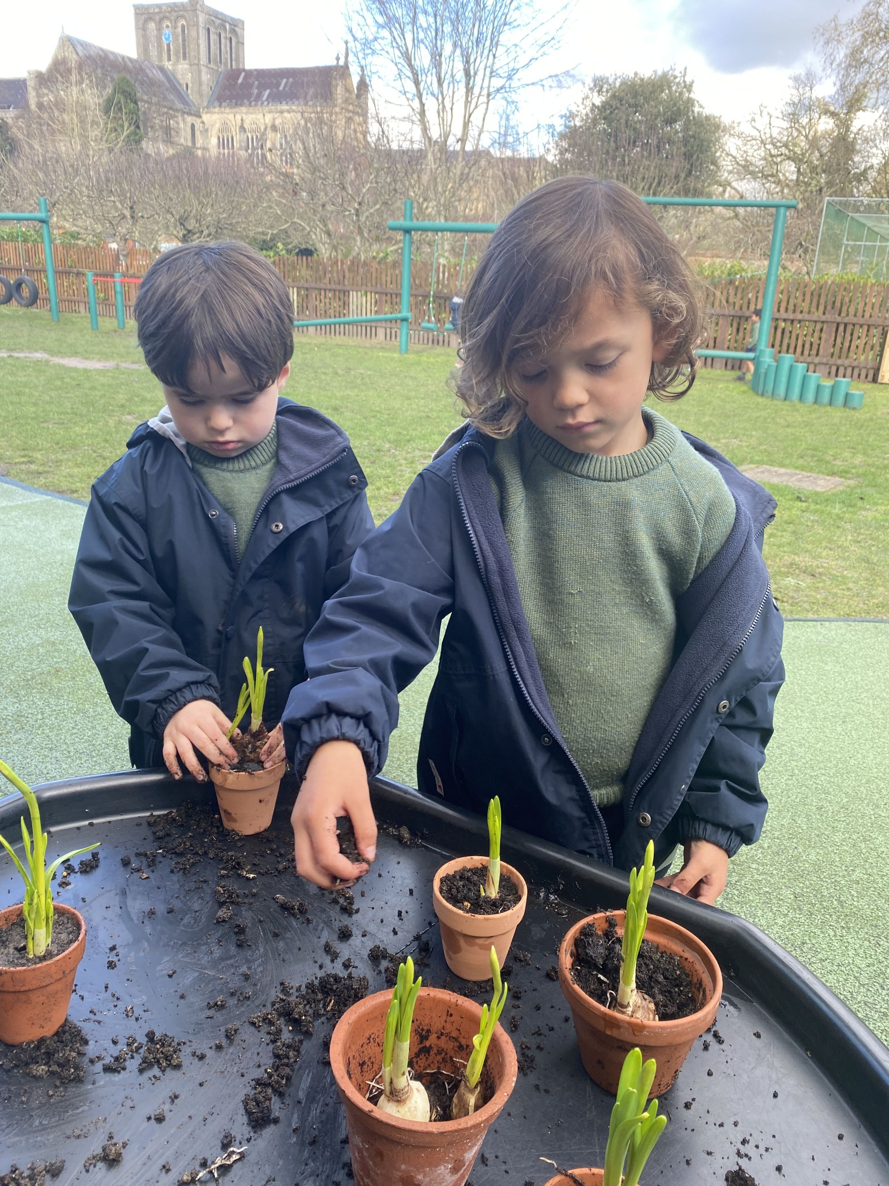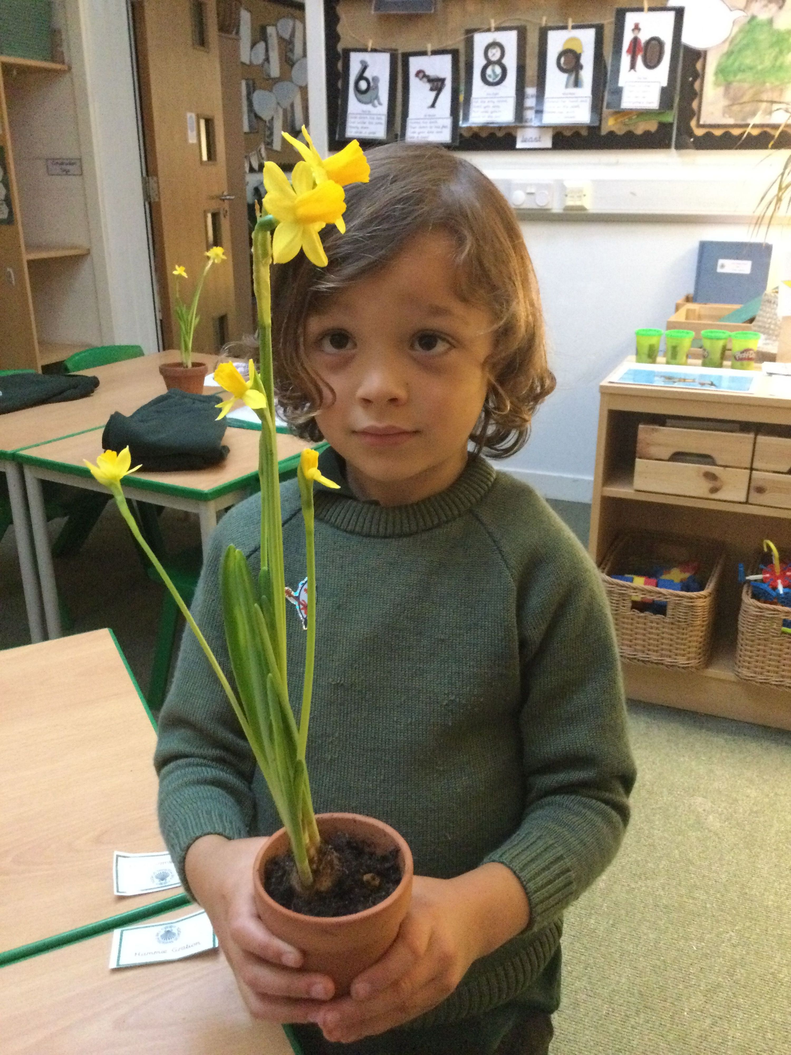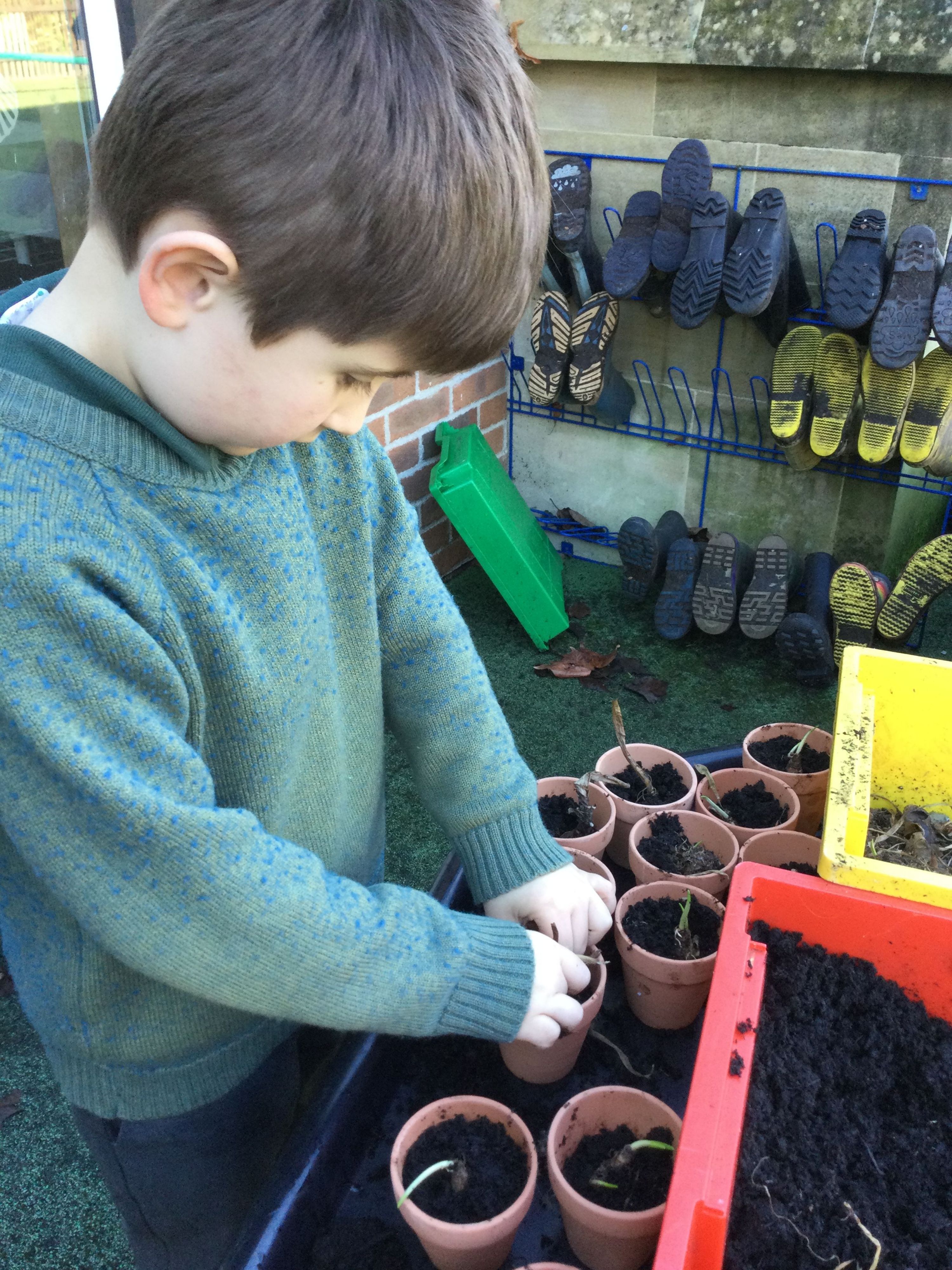 With spring so nearly on the horizon, Wednesday Lunchtime Potting Club is able to commence again. Boys from both Years 1 and 2 have been busy over the past two weeks planting spring bulbs to brighten up our classrooms. The daffodils that we planted last week have got taller each day this week! Next week shall be rather exciting as we may discover what flowers will appear out of the spring bulbs that we salvaged from some old planters in the school. We are hugely grateful to the Street family for their extremely kind donation of many small terracotta pots that have made our spring bulbs look even better.