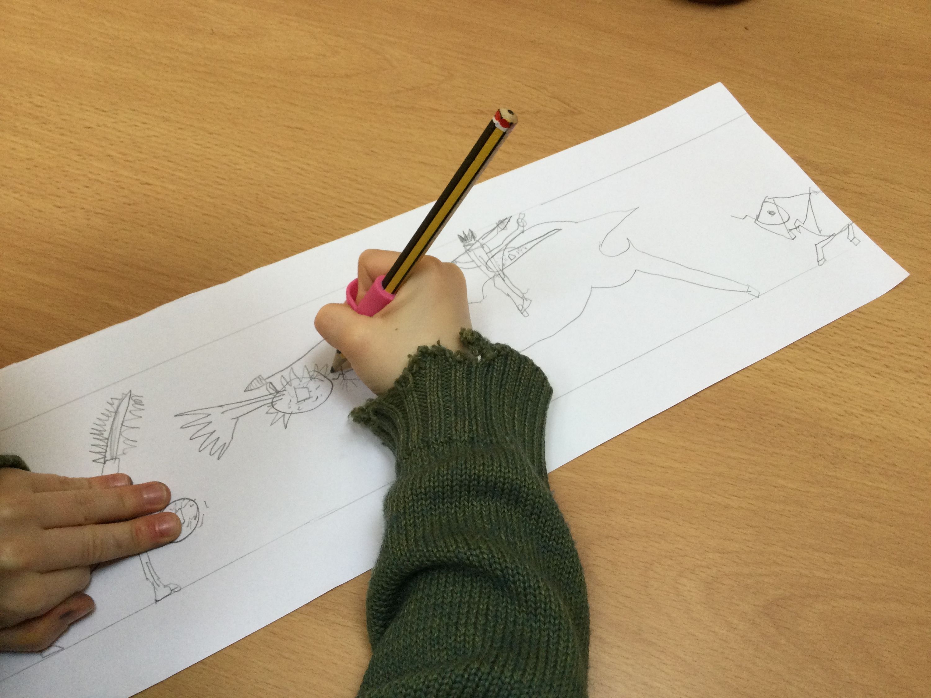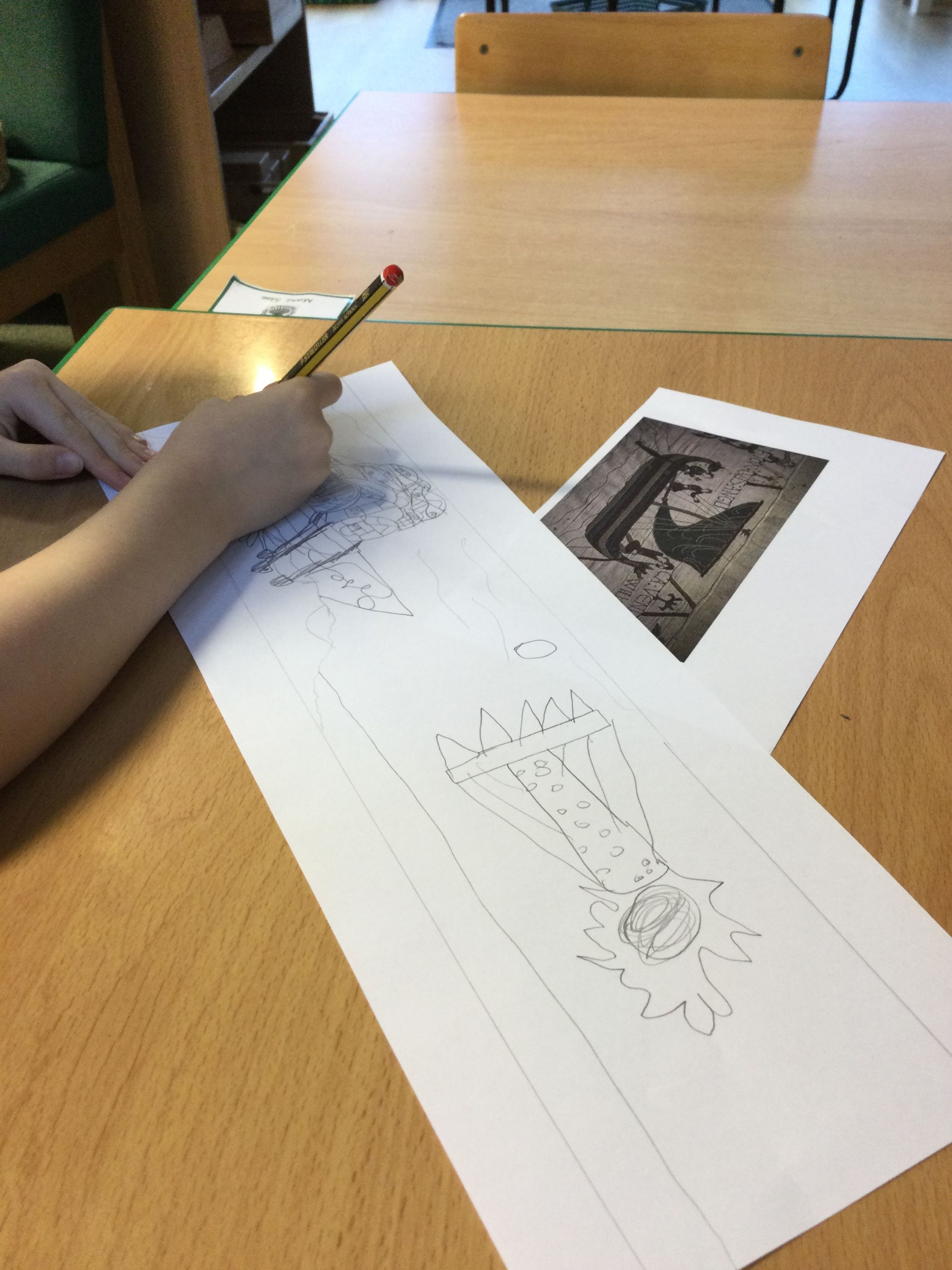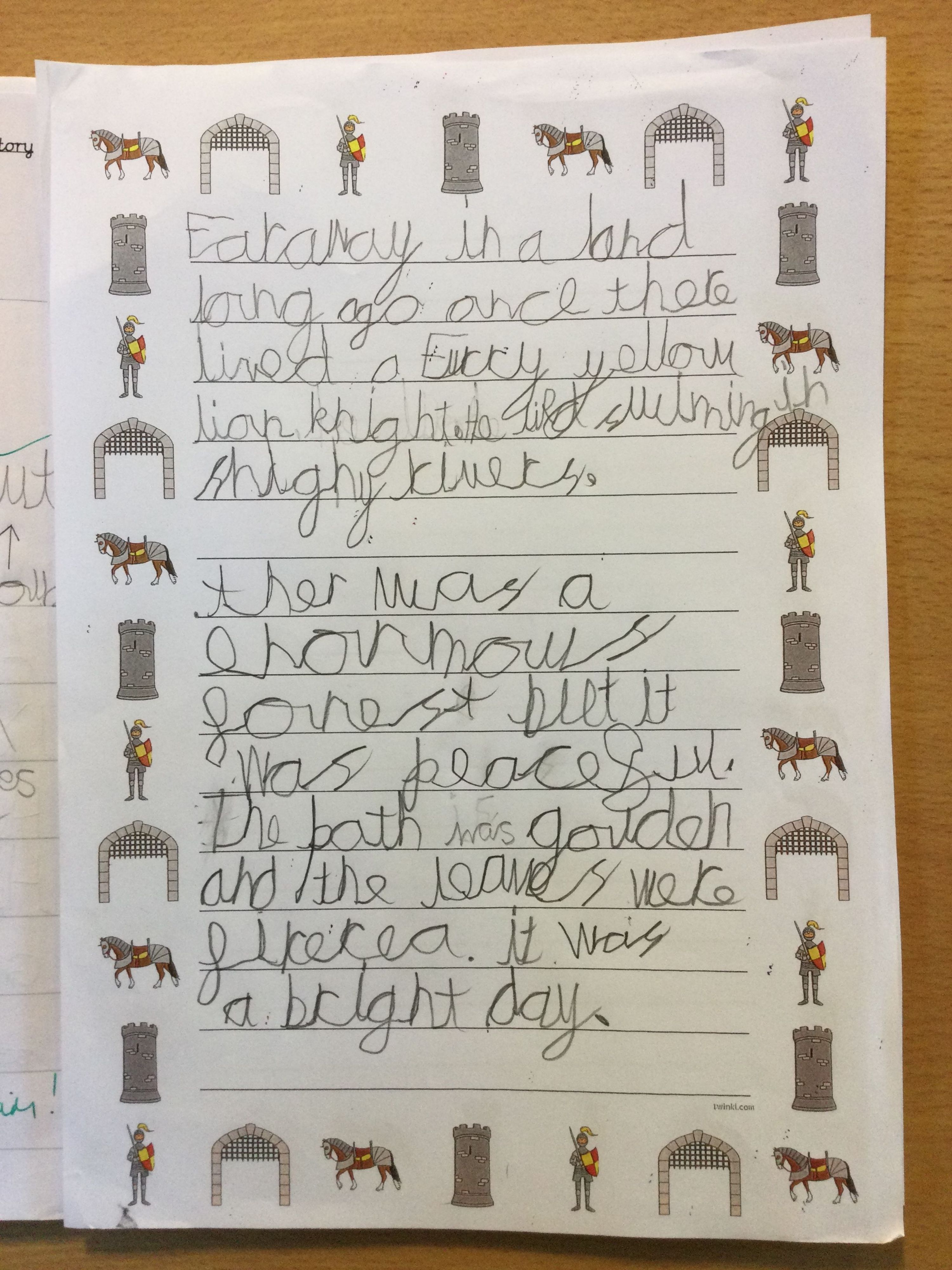 This story, all about a mouse knight who doesn’t want to fight any of the mythical creatures that he encounters but instead chooses to win them over by reading stories to them, has helped us shape our own knight tale. Much thought has gone into planning the boys’ stories they would like to write. They have all created their own knight characters, mythical creatures, story settings and have devised their story using a five-part story mountain structure.