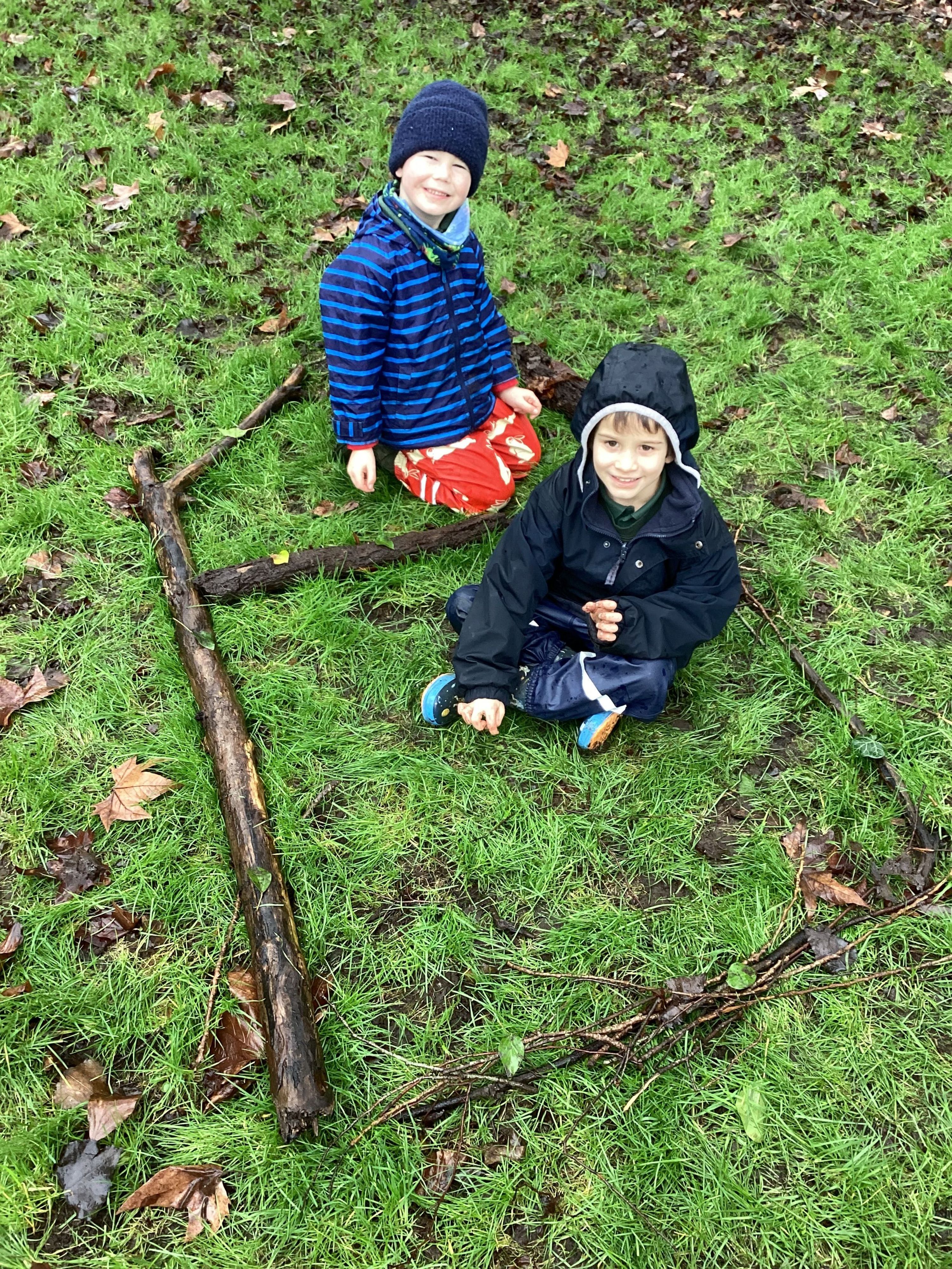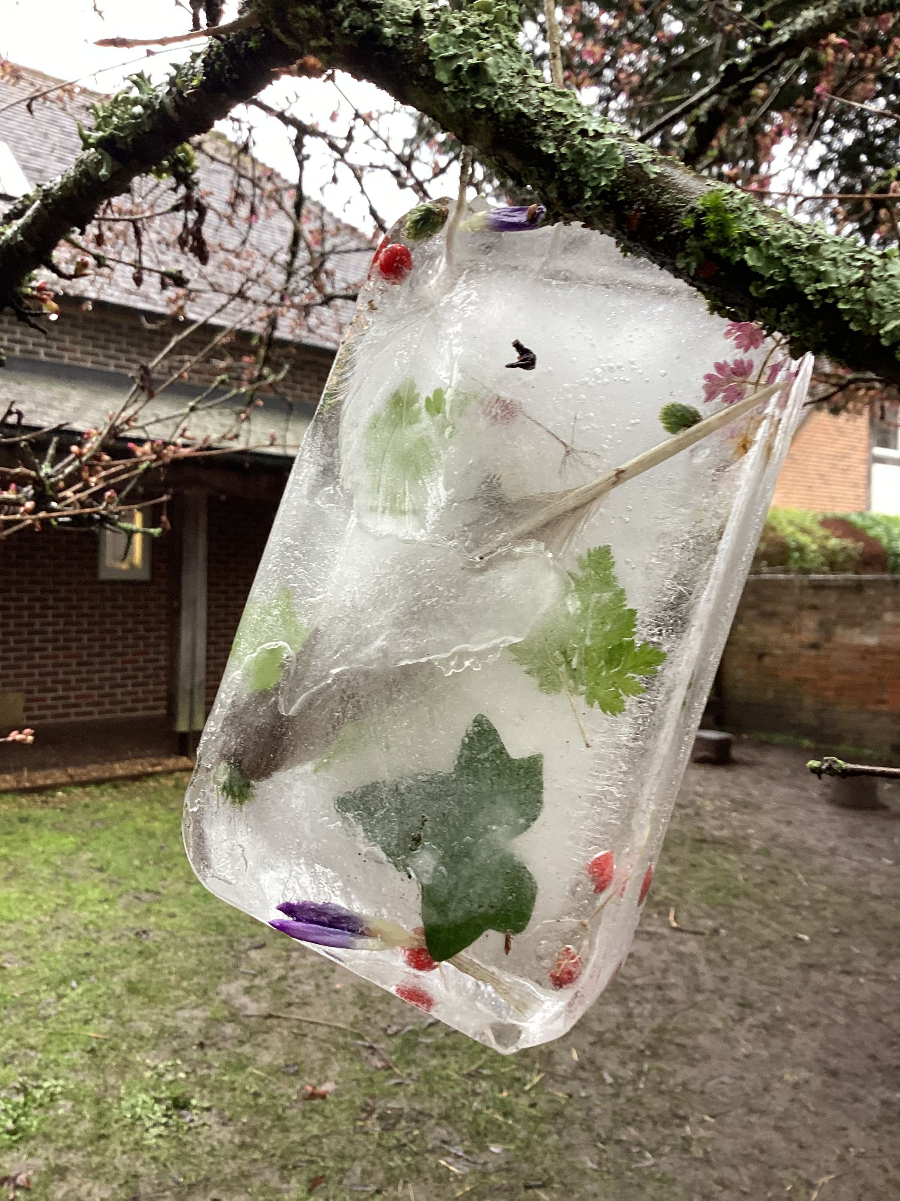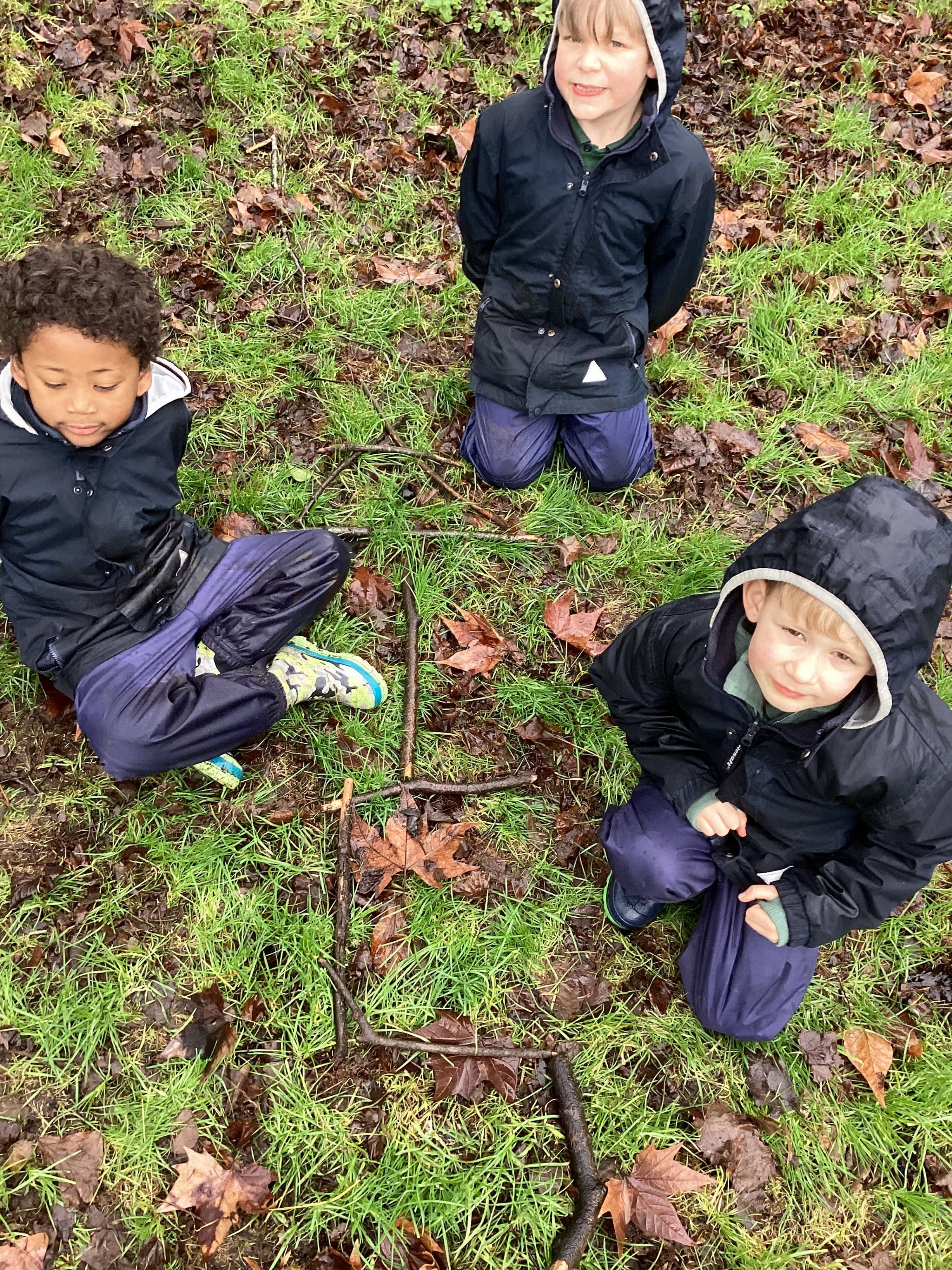 The boys in Year 2 were very excited to reveal their ice art from last week. The artwork was carefully removed from the containers and hung in the trees. As it captured the light, the hidden treasures sparkled among the branches. We also had fun using sticks creatively to make artwork based around their initials. Can you spot whose initials they are?