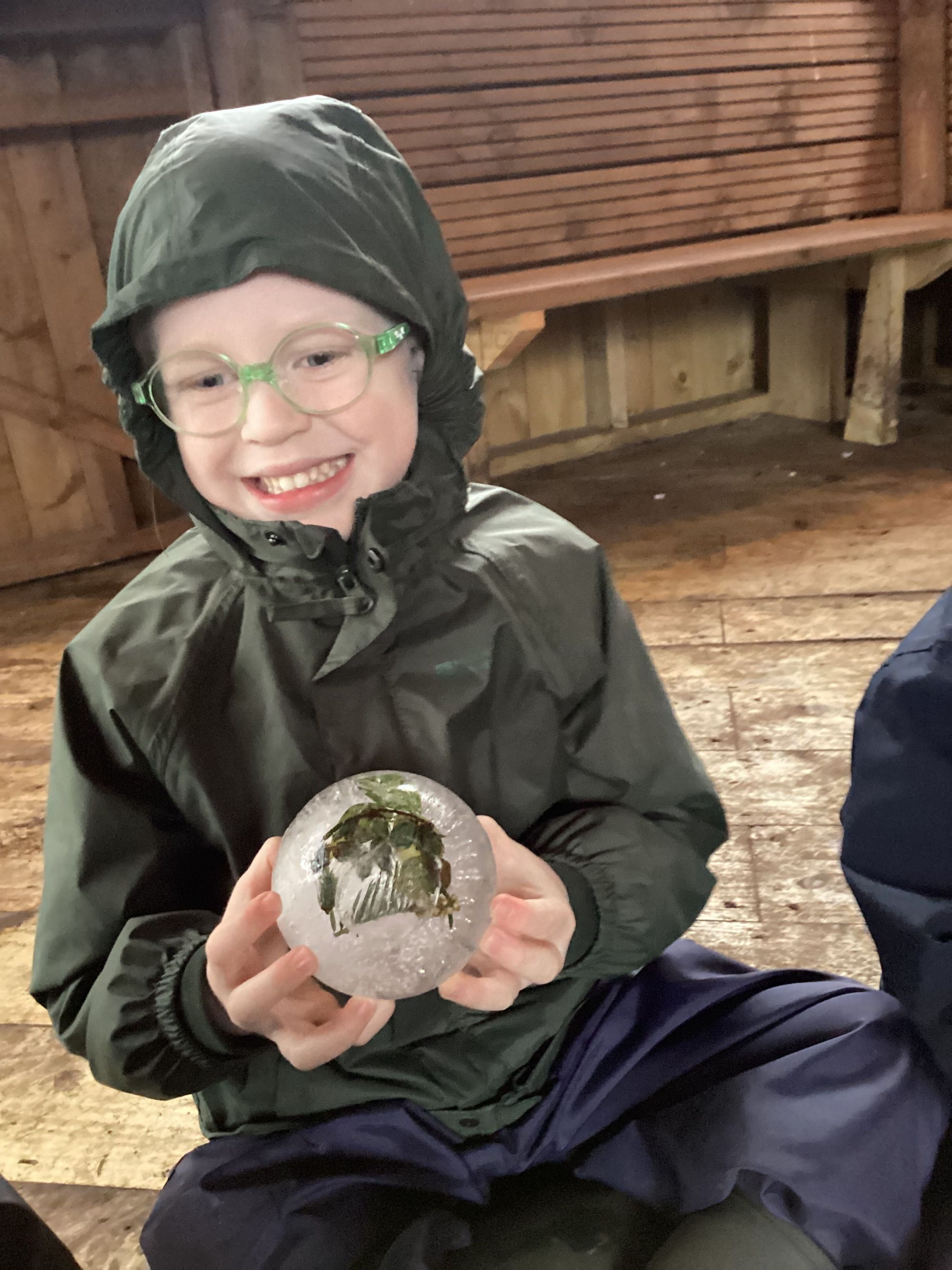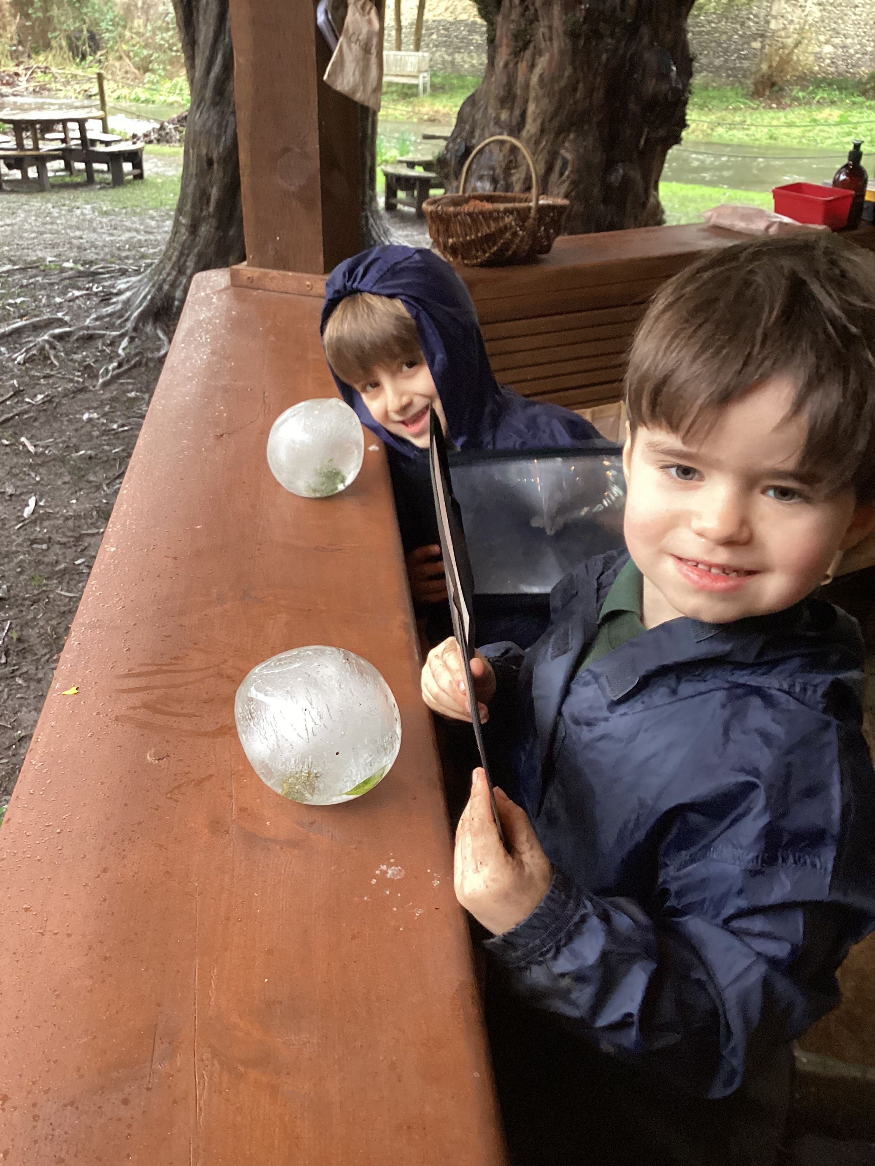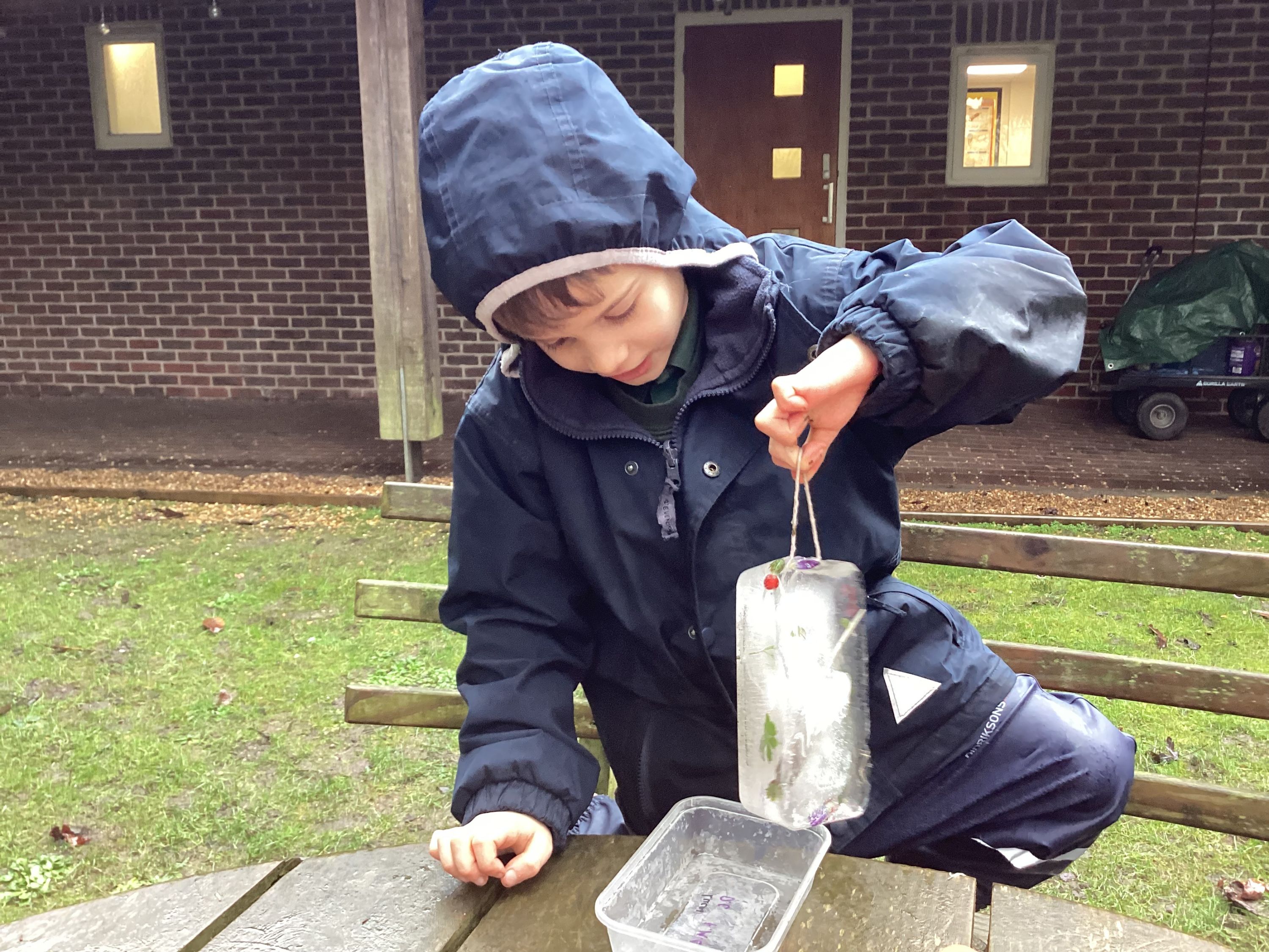 The boys in Year 2 were very excited to reveal their ice art from last week. The artwork was carefully removed from the containers and hung in the trees. As it captured the light, the hidden treasures sparkled among the branches. We also had fun using sticks creatively to make artwork based around their initials. Can you spot whose initials they are?