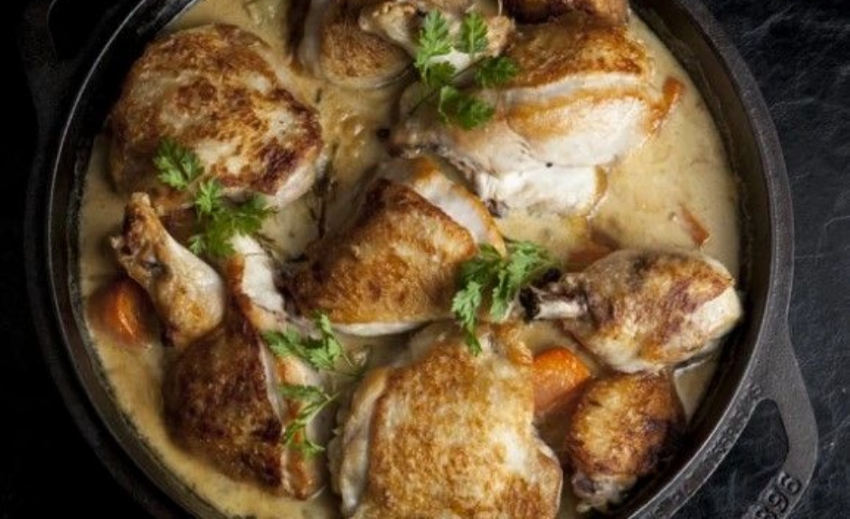 - Stir in the *moutarde* and *crème fraîche* and simmer for 10–15 minutes until the chicken is cooked through.