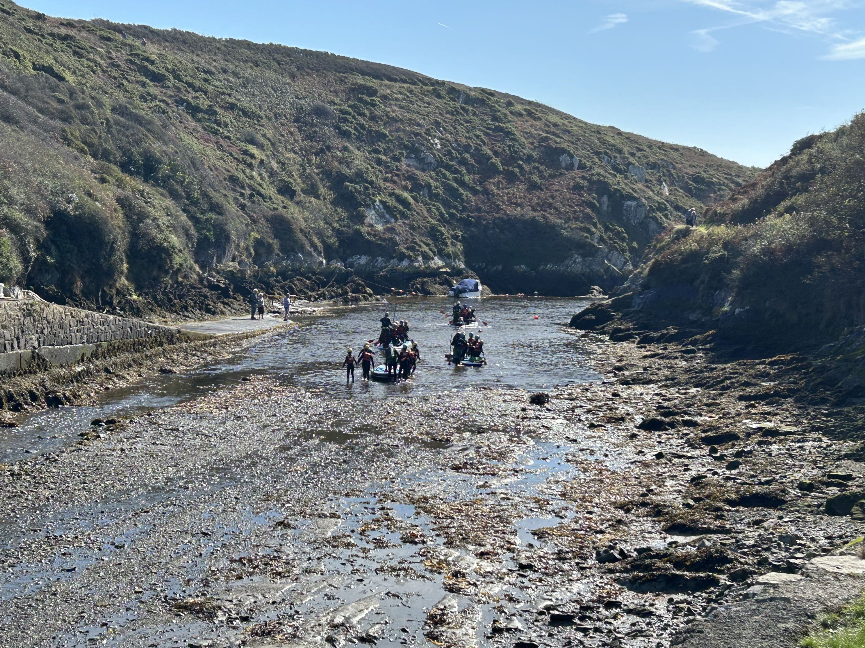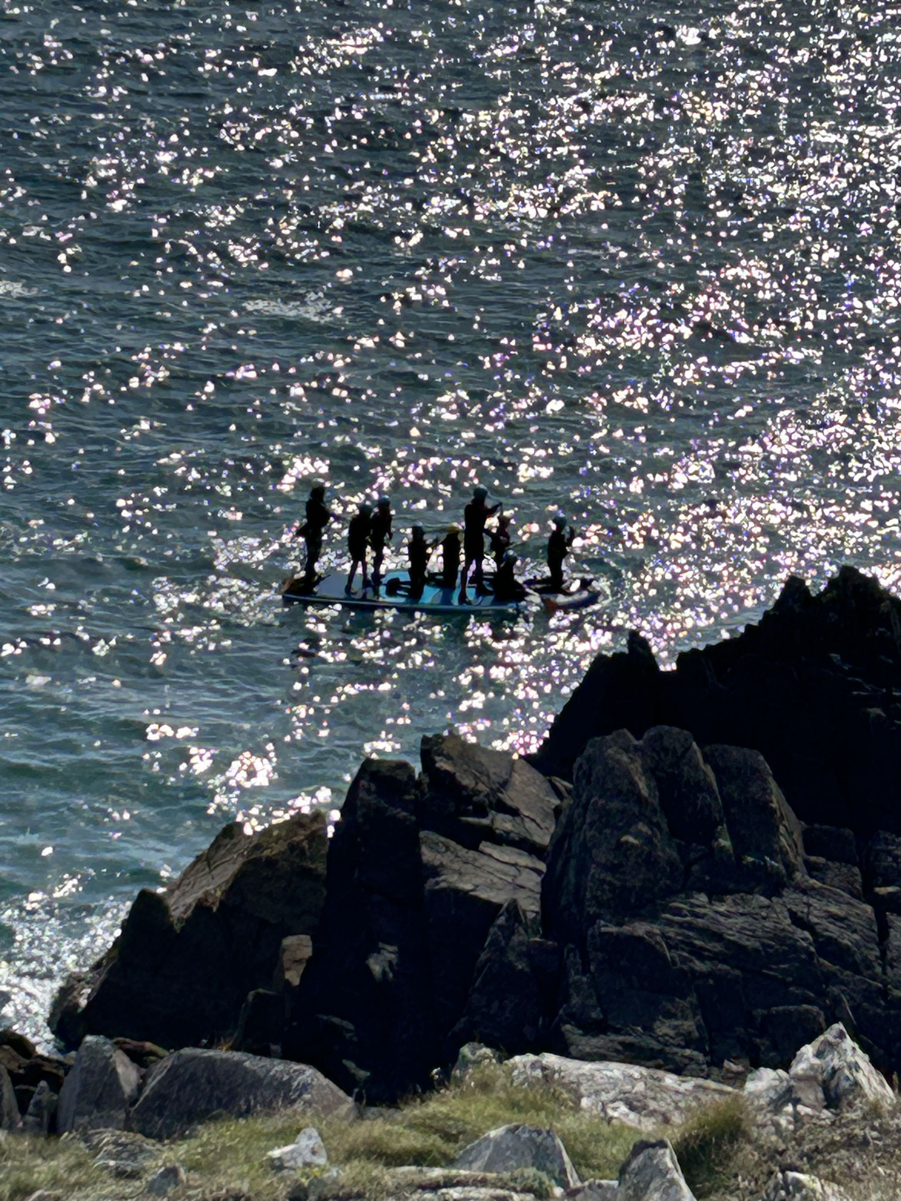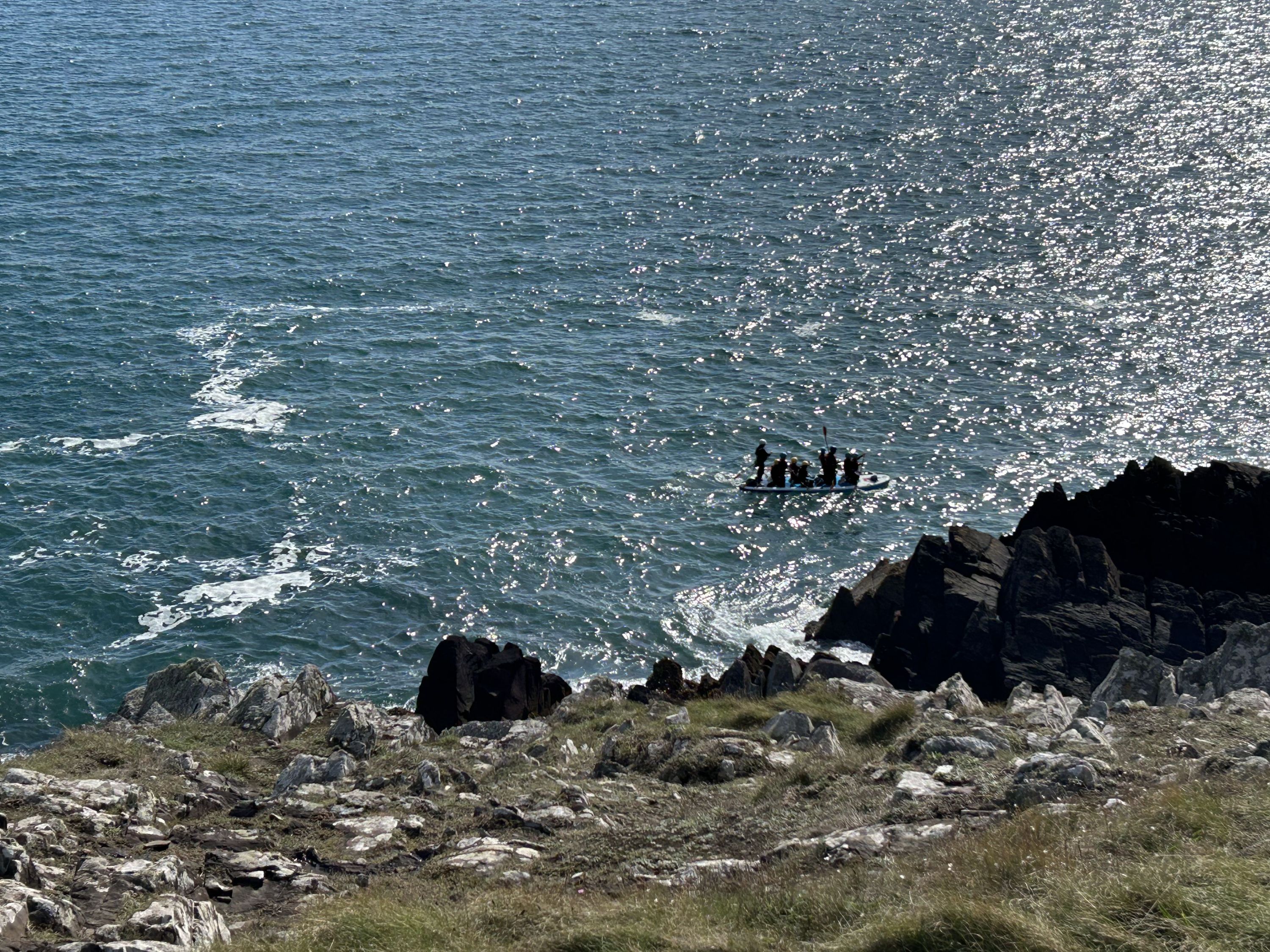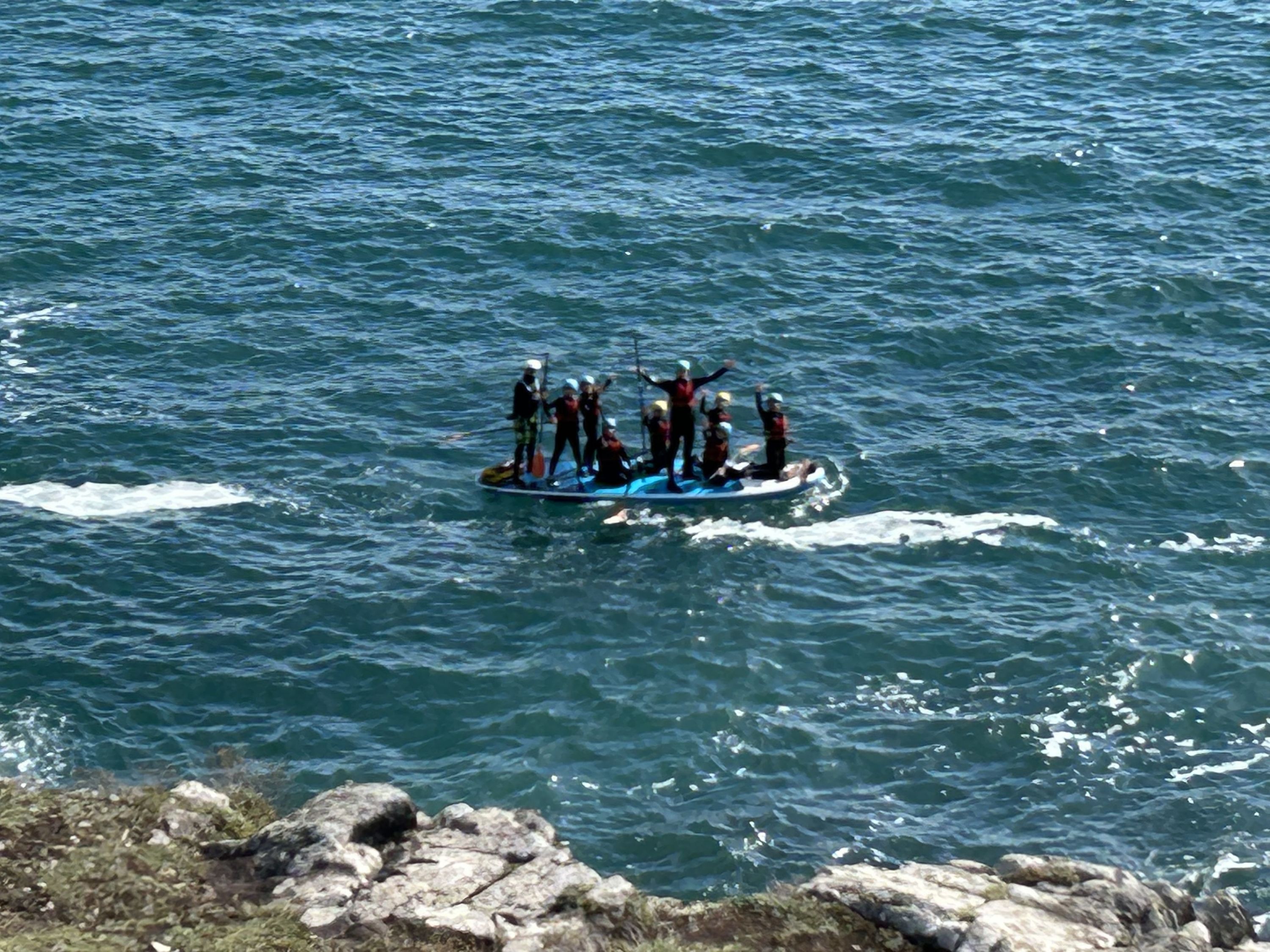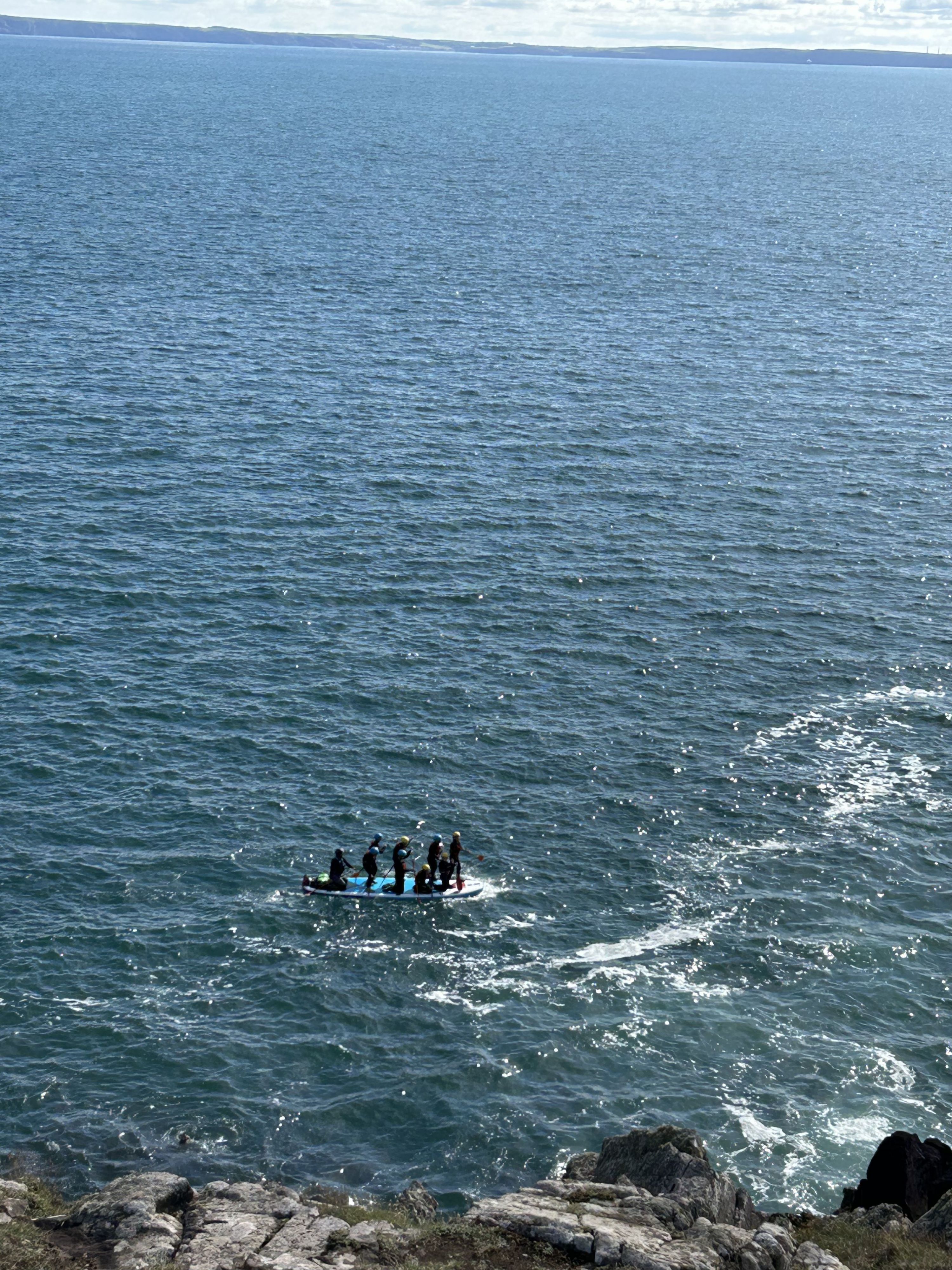 It dawned a glorious day on Wednesday. After a rather protracted grapple into wetsuits during the 'kitting up' process, we got the boys to the beautiful little Porthclais harbour for 10.15am. In teams, they undertook the mega stand-up paddle boarding (SUP), largely kneeling down! They had a brilliant paddle out along a short stretch of coast to the east of the harbour mouth, working in their teams of 7 and 8. The photos give you an idea of what a brilliant experience this was. En route, they were given an introduction to the nature of the Pembrokeshire coast as a special and protected environment.