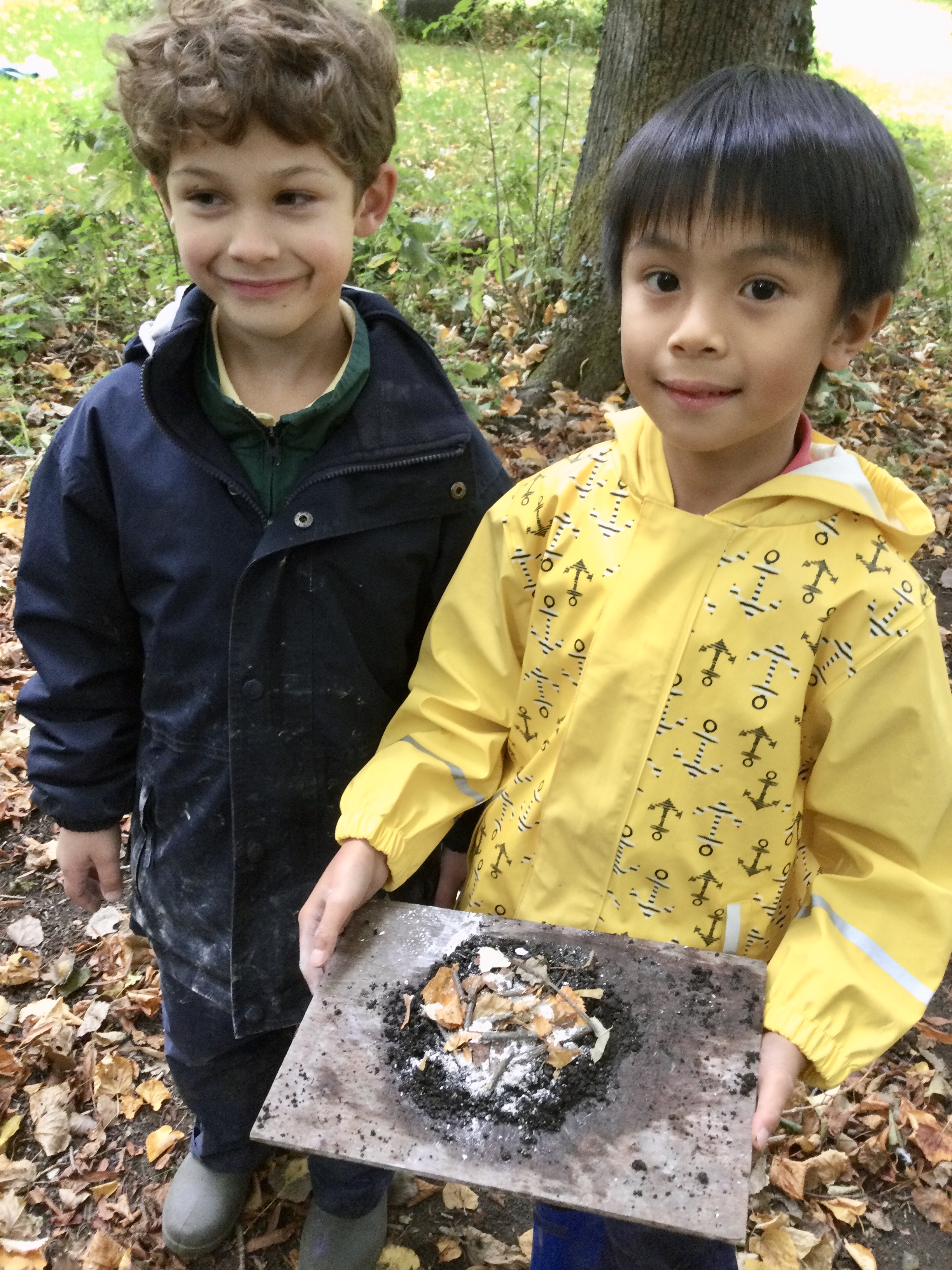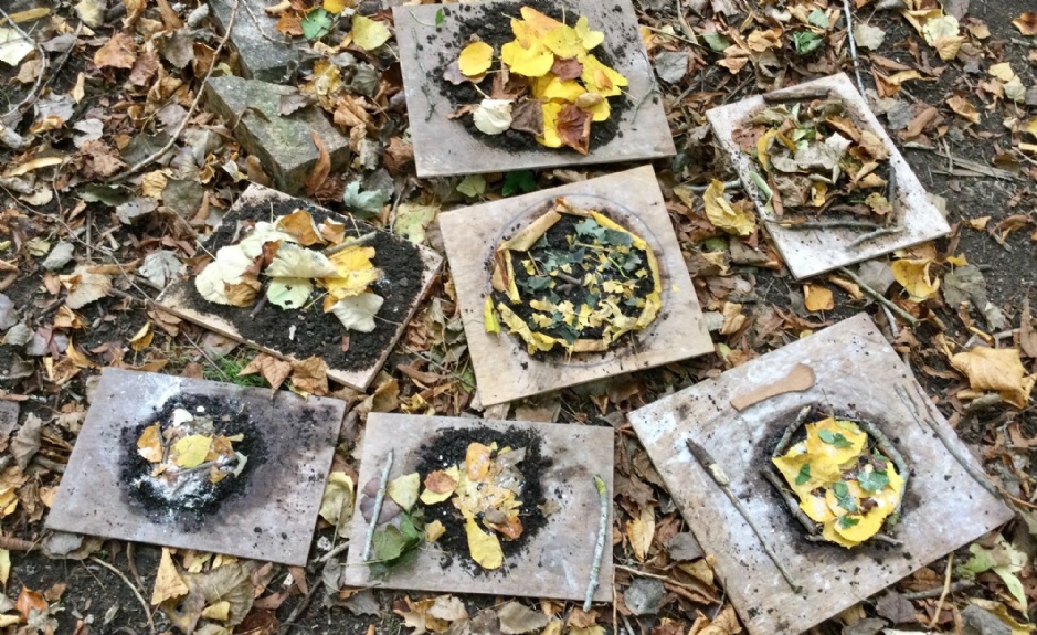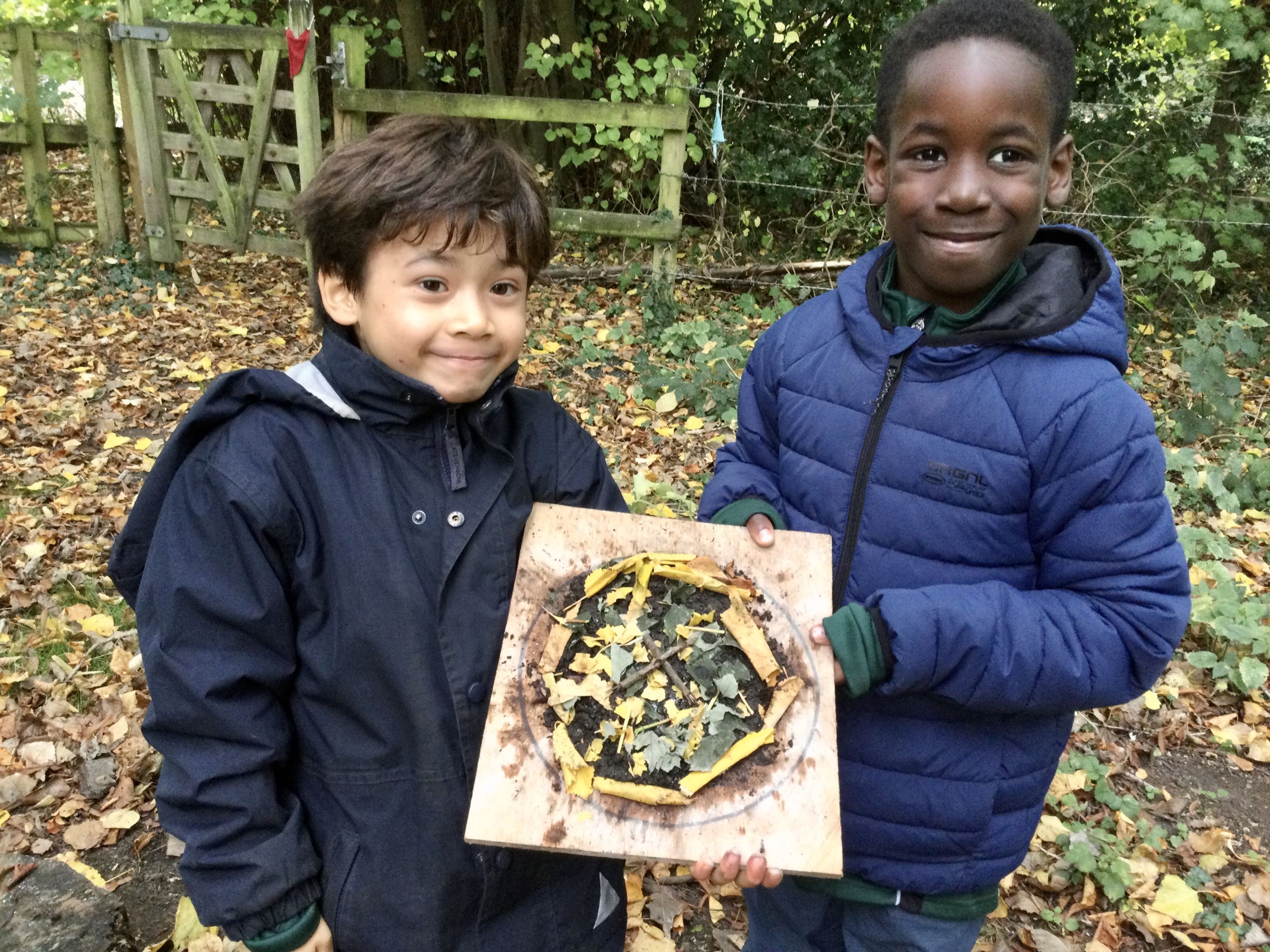 The boys were given a pizza board and encouraged to make a mud base to start. They then got creative using a range of natural items for their toppings: yellow leaves for cheese or pineapple, green leaves for olives, brown leaves for pepperoni or ham and grated chalk for parmesan! A couple of the boys even created a stuffed crust pizza!